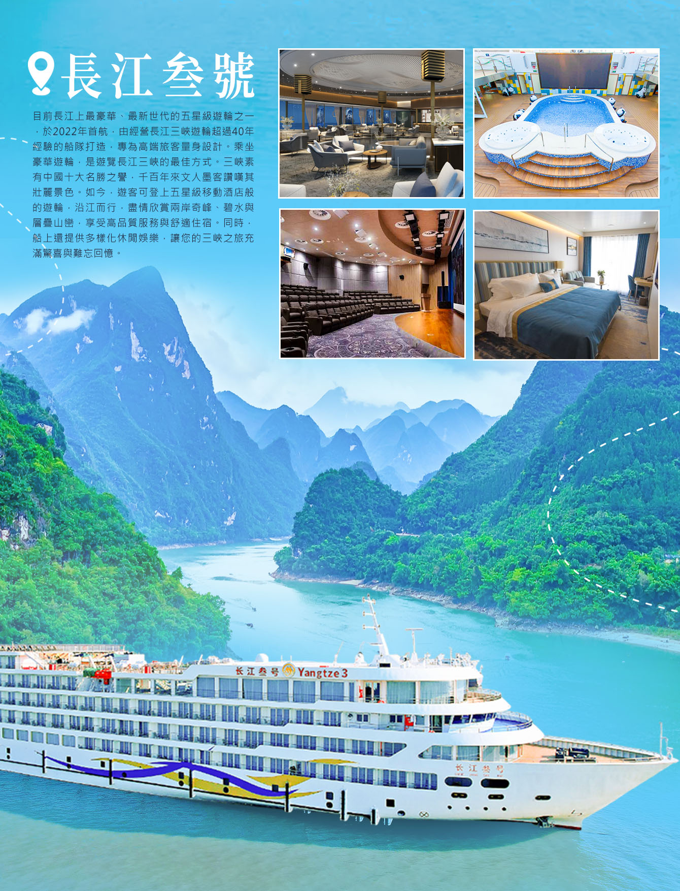 長江叁號目前長江上最豪華、最新世代的五星級遊輪之一,於2022年首航,由經營長江三峽遊輪超過40年經驗的船隊打造,專為高端旅客量身設計。
