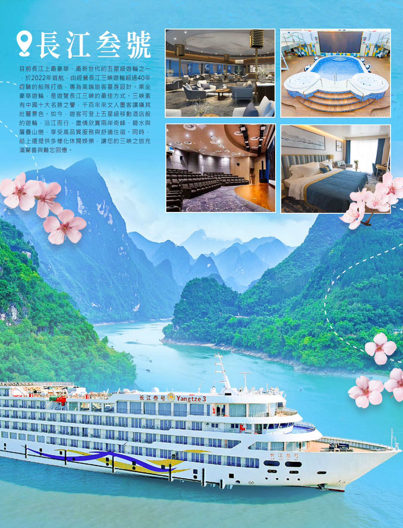 【長江叁號】目前長江上最豪華、最新世代的五星級遊輪之一,於2022年首航,由經營長江三峽遊輪超過40年經驗的船隊打造,專為高端旅客量身設計。
