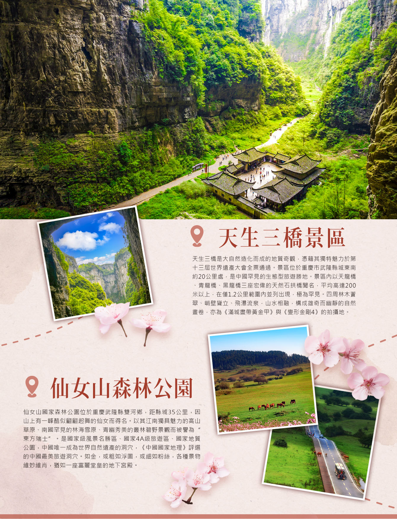 【天生三橋景區】美不勝收的絕佳天然景觀是大自然的神奇造化而賜給人類的瑰寶,他毫無懸念的被13屆世界遺產大會全票通過足以證明那獨特魅力所在。天生三橋位於重慶市的武隆縣城東南20公里處,是全中國罕見的地質奇觀生態型旅遊區。景區內遊覽路線從崖壁到谷底共5公里,以天龍橋、青龍橋、黑龍橋天生三座規模龐大,氣勢磅礡的石拱橋稱奇於世,三橋平均高200米以上,橋面寬約100米,在距離僅1.2公里的範圍內就有如此龐大的三座天生橋實屬國內罕見。景區林森木秀、峰青嶺翠、懸崖萬丈、壁立千仞、綠草成茵,修竹搖曳、飛泉流水,一派雄奇、蒼勁、神秘、靜幽的原始自然風貌,以山、水、瀑、峽、橋共同構成一幅完美的自然山水畫卷,其中天生三橋,飛崖走壁、擎天一柱、綠茵生輝、翁嫗送歸,仙女洞等景點引人入勝,使人留連忘返。也是張藝謀「滿城盡帶黃金甲」及《變形金剛4》的拍攝地。