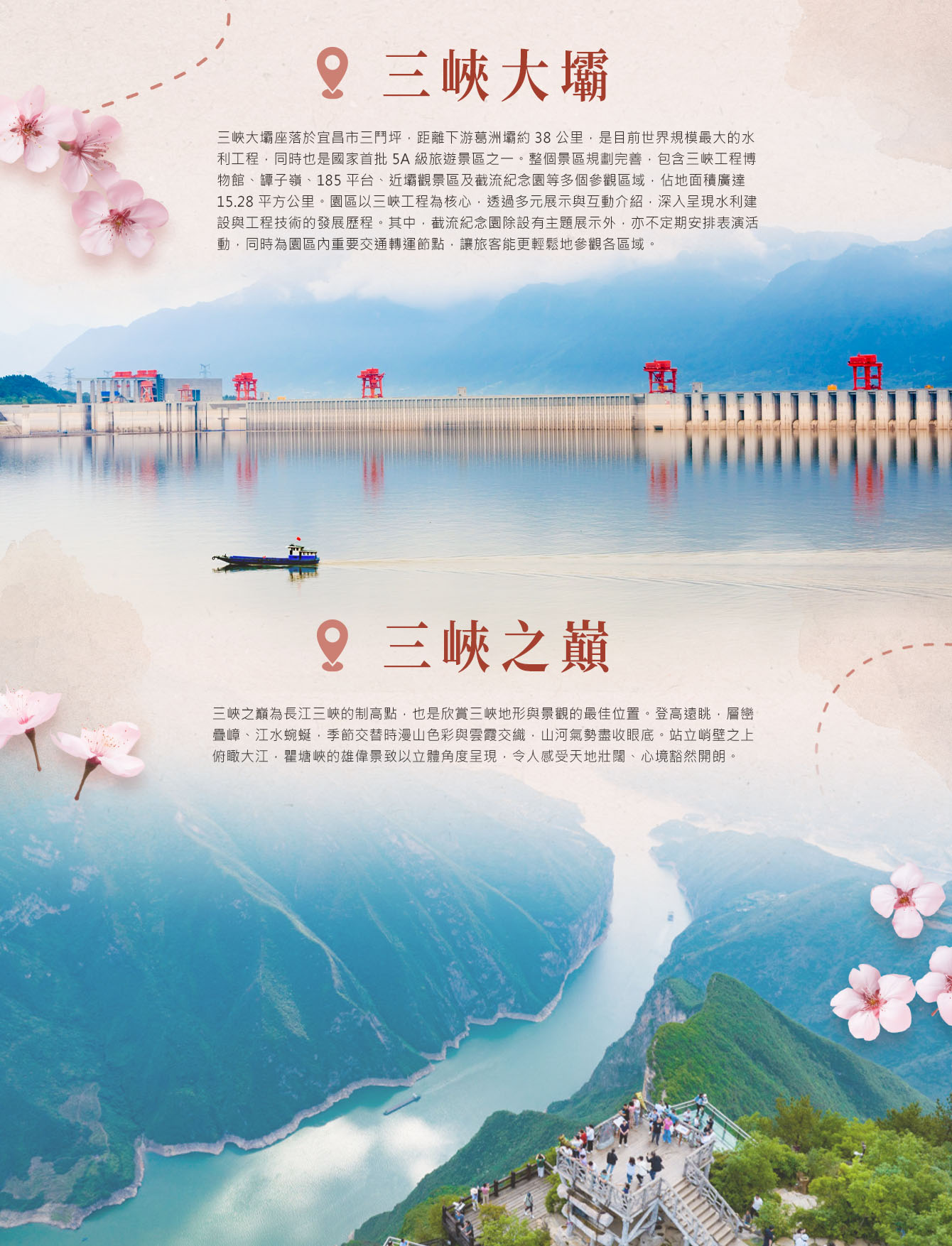 三峽大壩座落於宜昌市三鬥坪,距離下游葛洲壩約 38 公里,是目前世界規模最大的水利工程,同時也是國家首批 5A 級旅遊景區之一。