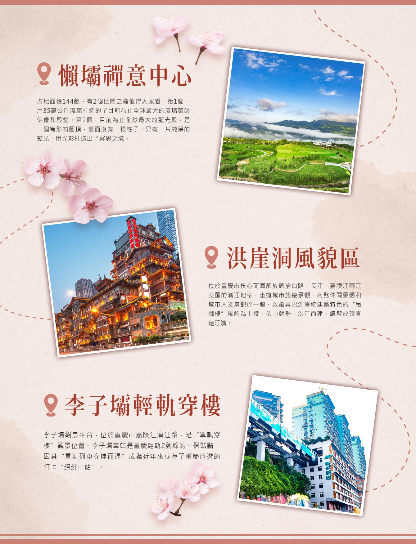 今日於機場集合,飛往素有「霧都」、「山城」之稱的重慶市。 重慶是中國四個直轄市之一,古稱巴,其歷史迄今已逾3000年,是中國著名的歷史文化名城,是巴渝文化的發祥地;地處中國內陸之西南,屬中亞熱帶季風氣候,由於城市依山而建,人謂「山城」;又因冬春雲輕霧重,又號「霧都」。航班 抵達重慶 ,抵達後由專業接送組負責接站(期間無導遊)接到遊客後 ,送往指定飯店入住(遊客在飯店服務台報姓名 ,憑護照、台胞證辦理登記入住手續)。 出站口僅供臨時停靠,需步行前往集合點上車 ,請理解!
