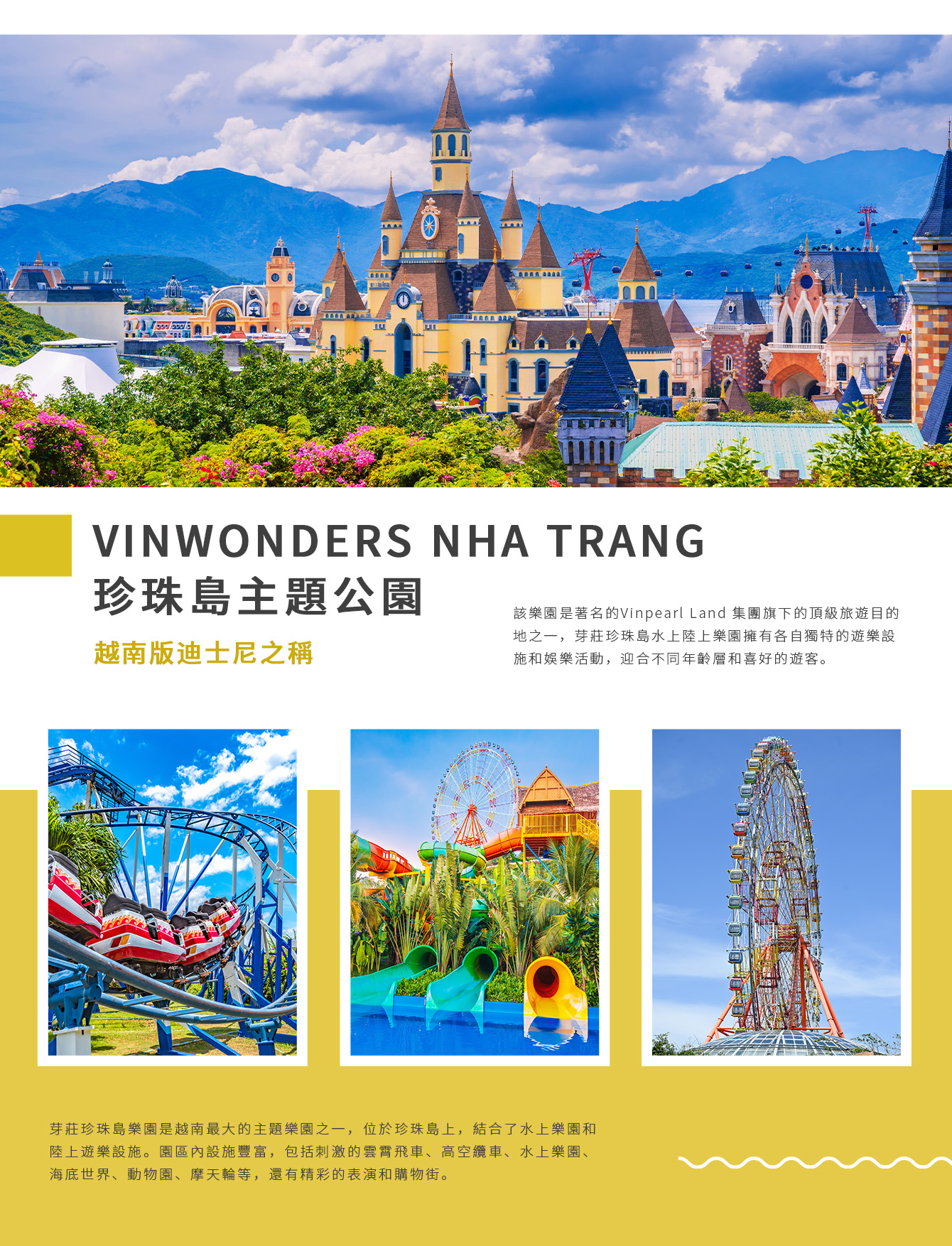 【VINWONDERS NHA TRANG 珍珠島主題公園】珍珠島水陸樂園渡假村(含樂園一票到底門票)越南最大的遊樂園,有東南亞迪士尼美稱精彩的樂園設施有: 過山車、自由落體、高山斜軌車、搖頭飛椅、大擺錘、礦山車等,摩天輪是樂園的新亮點(高200公尺),也是園區最新開放的熱區等活動精彩刺激,不限次數任君選擇。高山斜軌車是網紅推薦項目,一邊體驗刺激破表的速度,一邊欣賞芽莊灣美景喔!