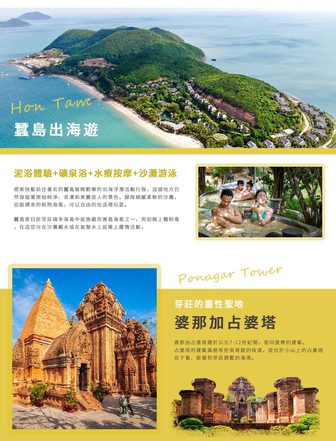 【蠶島 Hon Tam Island 出海一日遊】搭乘快艇前往著名的蠶島展開歡樂的出海浮潛活動行程,儘管芽莊旅遊產業發展很多年,但這個地方仍然保留著原始純淨、浪漫和美麗宜人的景色。 碧海藍天,微浪起伏,腳踩細膩柔軟的沙灘,迎面撲來的和煦海風,讓遊客可以自由的在這裡嬉戲玩耍。從空中俯瞰這座島嶼就像一隻小蠶,因此名為蠶島,是芽莊具有特色的島嶼之一。 島上被綠色植物填滿,像走進了原始深林的感覺遮天蔽日,如果經過一場雨的洗禮,那空氣就會格外清新,海水拍打著礁石奏響山與水的樂章。蠶島是目前芽莊諸多海島中設施最完善島海島之一,綿延的細白沙灘,宛如踏上麵粉島,在這您可在沙灘戲水或在氣墊水上設備上盡情活動,也可在島上的數個泳池游泳玩樂或自費享用飲料,中午在島上享用午餐,島上遊客多,遊客多在 11:30-13:00 前往用餐 ,下午島上會不定時安排歌舞表演,表演區靠近泳池吧台區,陽光、沙灘、2400 平米泳池和占地大的休憩區,特別安排島上礦物質豐富的泥漿浴,其他水上自費活動,請參照島上公告的費用自費選購,在此我們享受芽莊最迷人的海島假期。