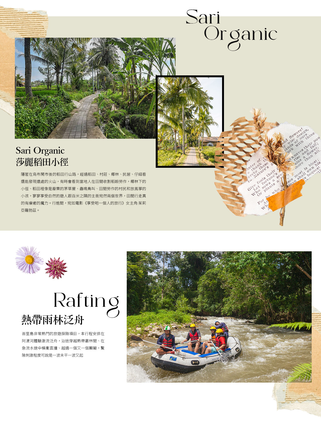 國寶蠟染工昉→熱帶雨林泛舟 →2025最熱門網美Sari Organic莎麗稻田小徑→烏布皇宮→烏布藝術市集→I CON MALL 沙努區最新海邊商場
