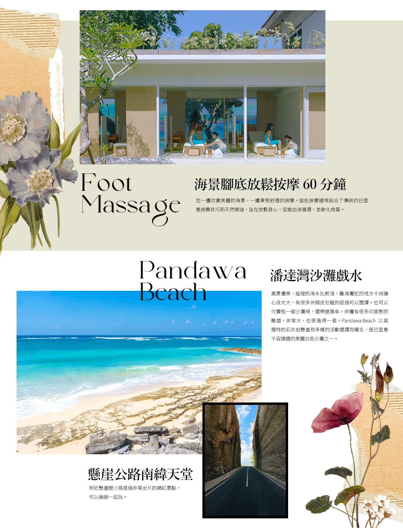 海景腳底放鬆按摩60分鐘(可升級NT 300更換天然精油身體按摩60分鐘) 出發前七日前告知 →潘達灣Pandawa沙灘戲水+懸涯公路→金巴蘭海灘美景