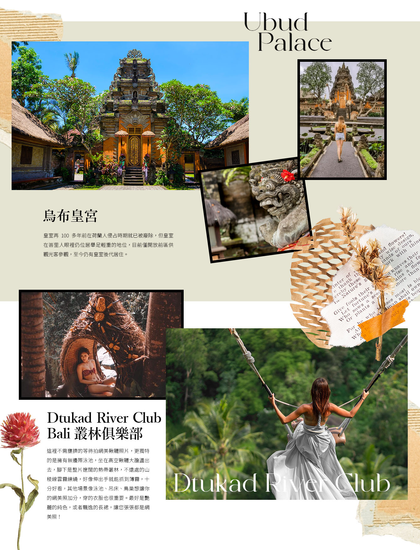 蠟染工藝(可自備T桖繪畫)→烏布皇宮+市集((贈送義式冰淇淋))→Dtukad River Club Bali叢林俱樂部 (鞦韆,瀑布景觀無邊泳池,叢林瀑布,鳥巢,午餐,飲料)-IG仙女餐廳下午茶