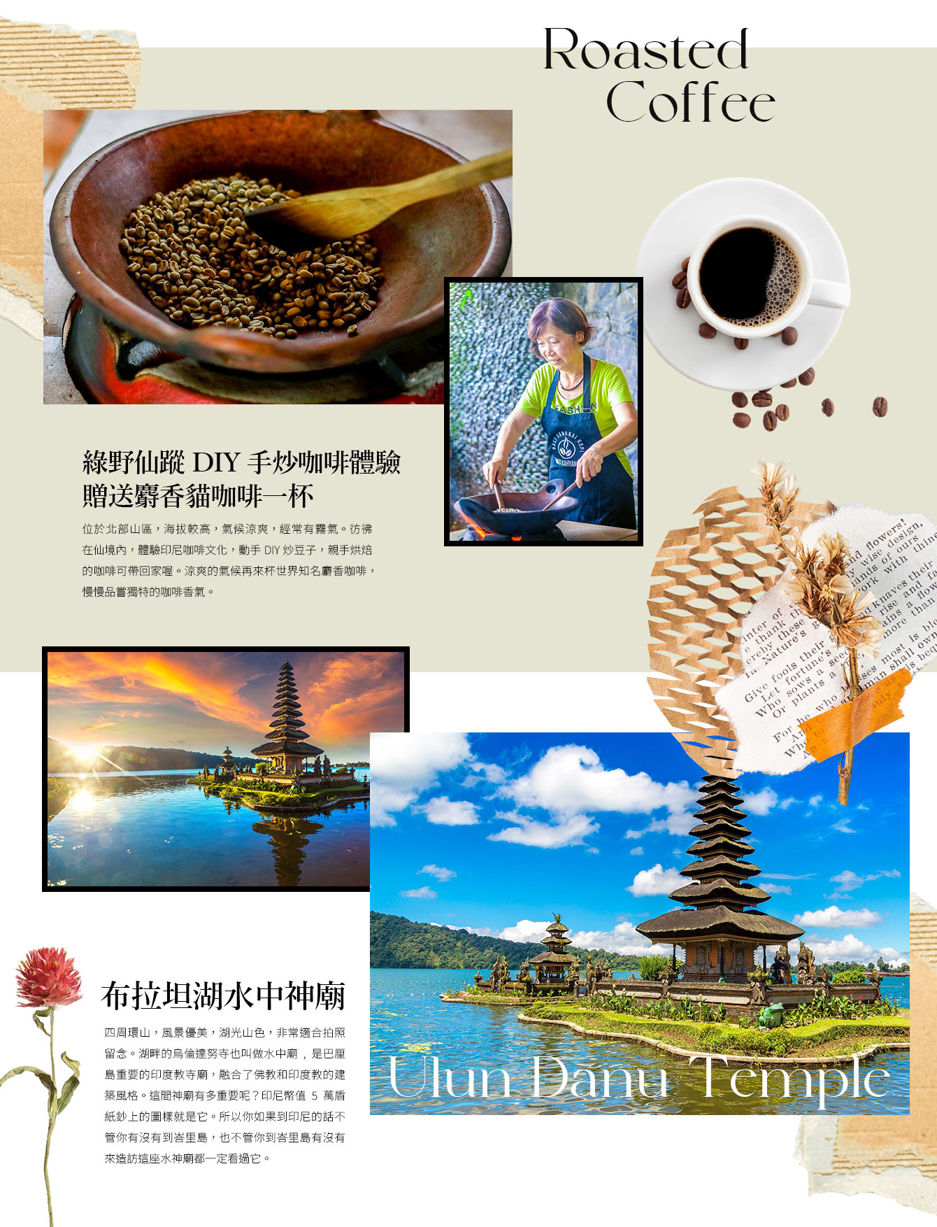 【綠野仙蹤DIY手炒咖啡體驗+贈送麝香貓咖啡一杯品嘗】位於巴厘島北部山區,海拔較高,氣候涼爽,經常有霧氣。彷彿在仙境內,體驗印尼咖啡文化,動手DIY炒豆子,越炒~咖啡濃郁的香氣越來越濃,體驗後,親手烘焙的咖啡可帶回家喔。涼爽的氣候再來杯世界知名麝香咖啡,慢慢品嘗獨特的咖啡香氣。