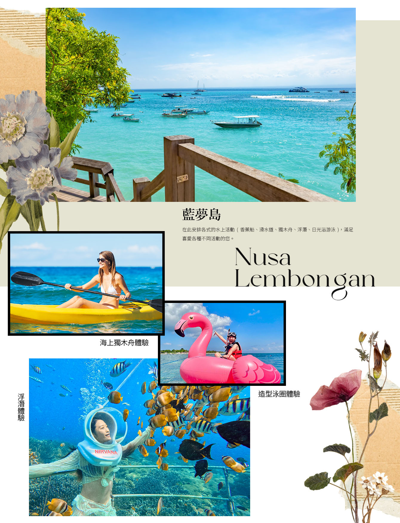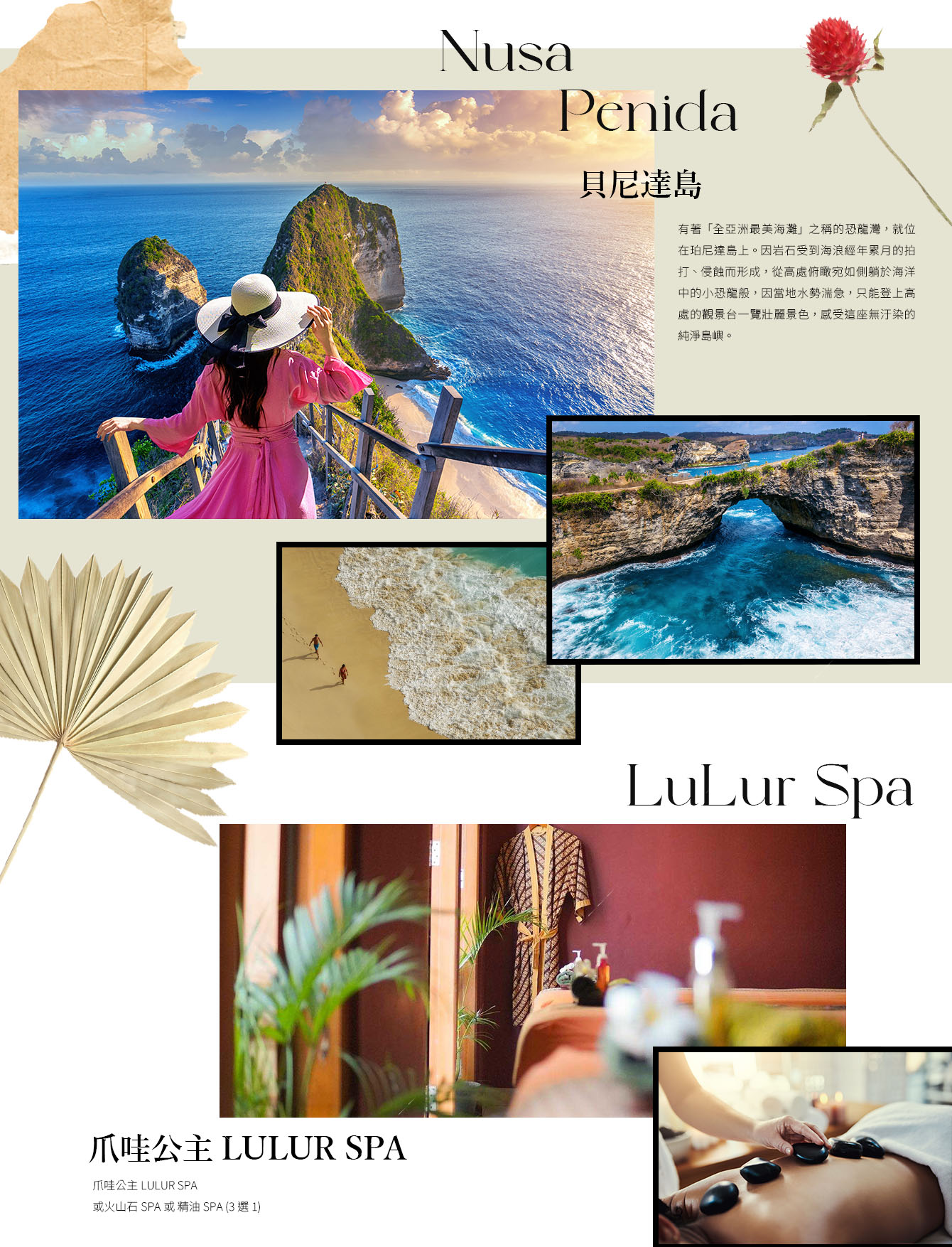 【藍夢島】 完全不同於峇里島的風景,島上可以觀賞到當地居民的生活起居,最著名的惡魔的眼淚是最佳觀潮地點,也是藍夢島最美景點之一。除了安排島上觀光外(惡魔眼淚+夢幻沙灘)。
