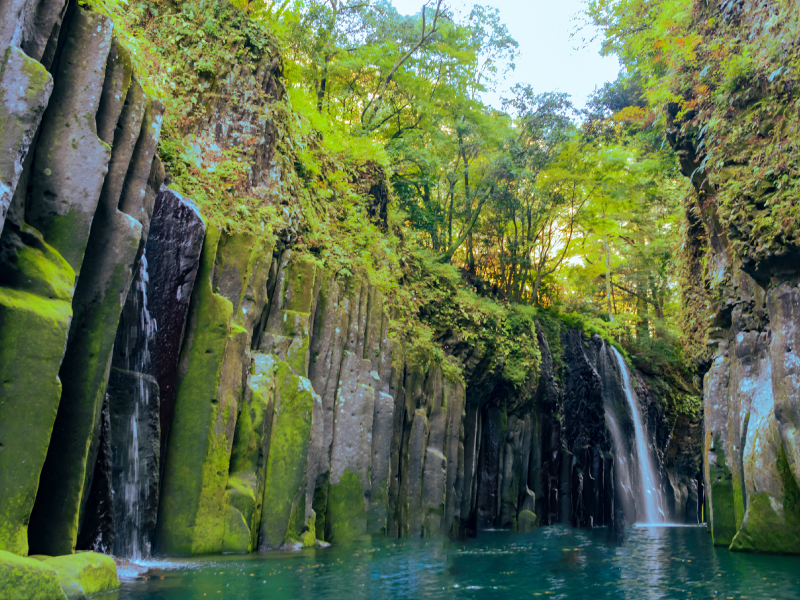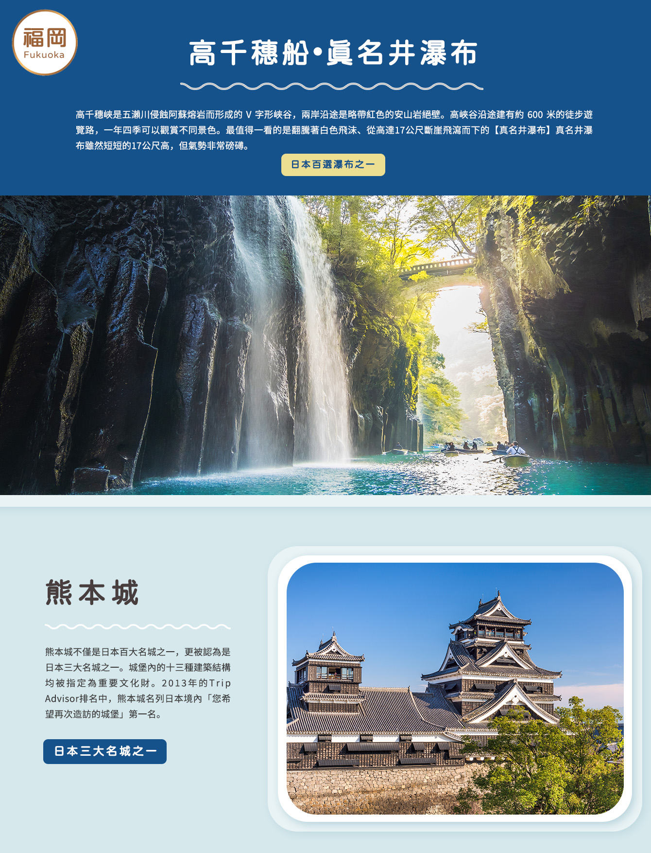 【高千穗船】是日本宮崎縣人氣景點,高千穗峽是國家名勝、秘境絕景,同時這邊是日本神話故事「天孫降臨」發源地,此地有非常多關於日本神話的景點。【高千穗峽‧真名井瀑布】 高千穗峽是五瀨川侵蝕阿蘇熔岩而形成的 V 字形峽谷,兩岸沿途是略帶紅色的安山岩絕壁。高峽谷沿途建有約 600 米的徒步遊覽路,從春天到初夏山櫻花、杜鵑花、紫藤妝點岸壁,秋天紅楓盡染,一年四季可以觀賞不同景色。最值得一看的是翻騰著白色飛沫、從高達17公尺斷崖飛瀉而下的【真名井瀑布】真名井瀑布雖然短短的17公尺高,但氣勢非常磅礡。真名井瀑布名列日本百選瀑布之一。