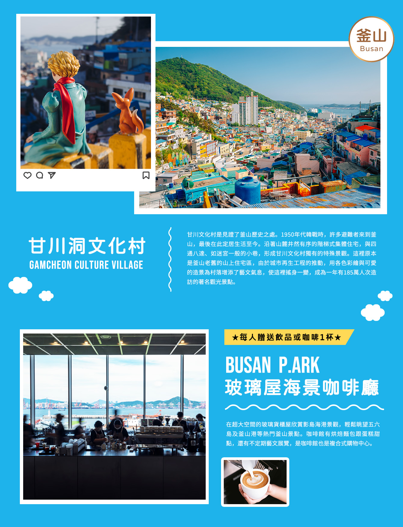 【甘洞洞文化村】位於釜山市沙下區的甘川文化村被CNN報導稱為"亞洲最藝術的村落",充滿壁畫、塗鴨、裝置藝術的甘川村,本身就是一件超大型藝術品,是釜山最熱門的新興景點,每年有超過30萬的旅客。甘川村的舊名是甘內、又被叫做多大里,有一說是因為泉水甘甜,另一說則是有神明居住。2009年時進行了村落美術計畫,遂變成了五顏六色的文化村,又名韓國的馬丘比丘。近來因為綜藝節目RunningMan前往拍攝,也成了熱門景點。