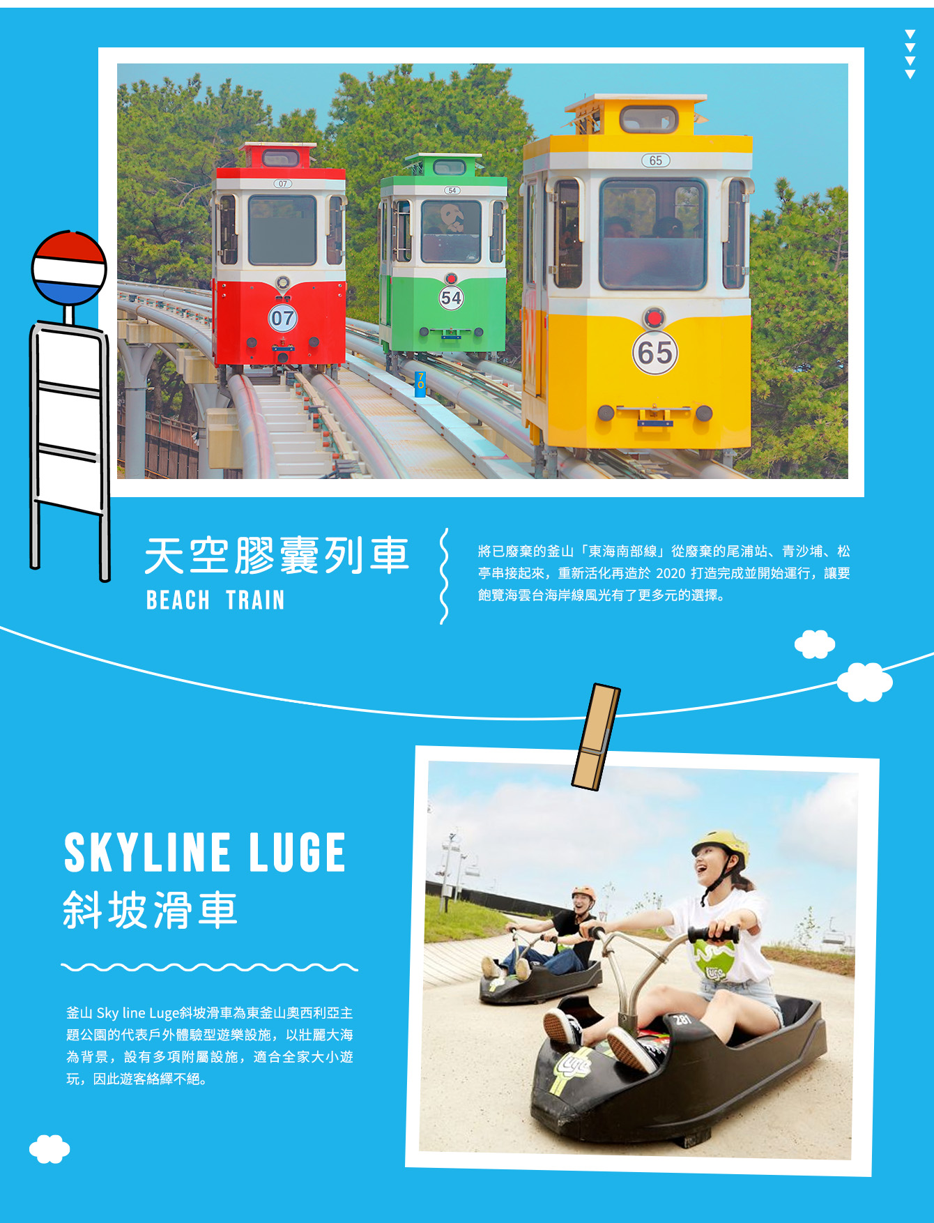 【天空膠囊列車】是廢棄路線的釜⼭「東海南部線」,從廢棄的尾浦站,與青沙浦、松亭串連起來,成為釜⼭最近的話題「海雲台藍線觀光列⾞」。