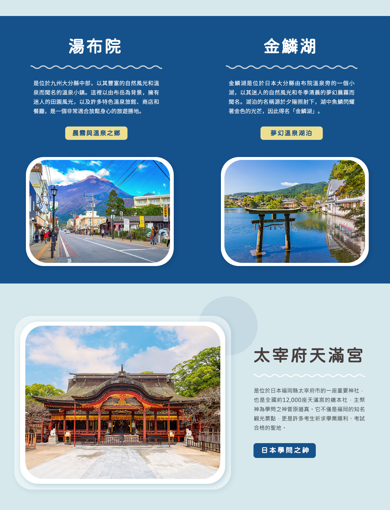 【『晨霧和出泉之鄉』美稱的湯布院】街道充滿歐風的小鎮,朝霧是最有名之代表,除溫泉湯霧終日炊煙外,清晨時段整座小城市,便籠罩於霧氣中。四周環繞著雄偉的由布岳,是日本溫泉三大湧出量最多溫泉之一,在日本常榮登「最想去的溫泉區」排行榜,這個古老的小山城洋溢著悠閒的渡假氣氛,湖光山色的自然美景引人入勝,讓遊人充分感受到此地濃郁的文化氣息,有許多美術館及畫廊,是一個幽靜典雅的山中城鎮;湯布院街道充滿藝術氣息的城鎮,經常榮登日本人氣之觀光區,在此您可盡情享受城鎮的好山好水好風光,其精巧的陶藝、木雕、彩繪玻璃及壓花等民間藝術皆極出色。