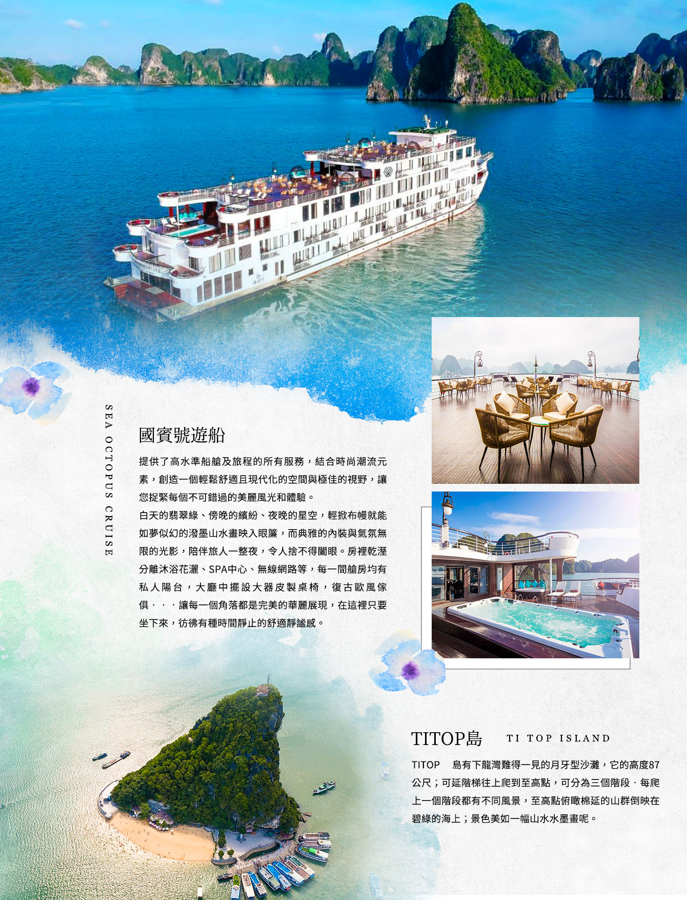 Ti Top島擁有下龍灣少數的潔白沙灘,在此可自費選擇兩人一艘獨木舟划行於美麗寧靜的海域,由於圍繞著大小石灰岩島,這些海域平靜無波如同內陸湖泊,可輕鬆享受划獨木舟的樂趣(視天氣狀況)或可選擇於沙灘遊玩,也可選擇沿著島上山丘的400階長梯登高至頂島瞰整體的下龍灣風景。或者 Soi Sim島面積8.7公頃 ,島上二個山丘,200階長梯登高觀景下龍灣美景,充滿寧靜氛圍,綠色原始森林也有猴子穿梭其中,一樣有迷人沙灘清澈海水。