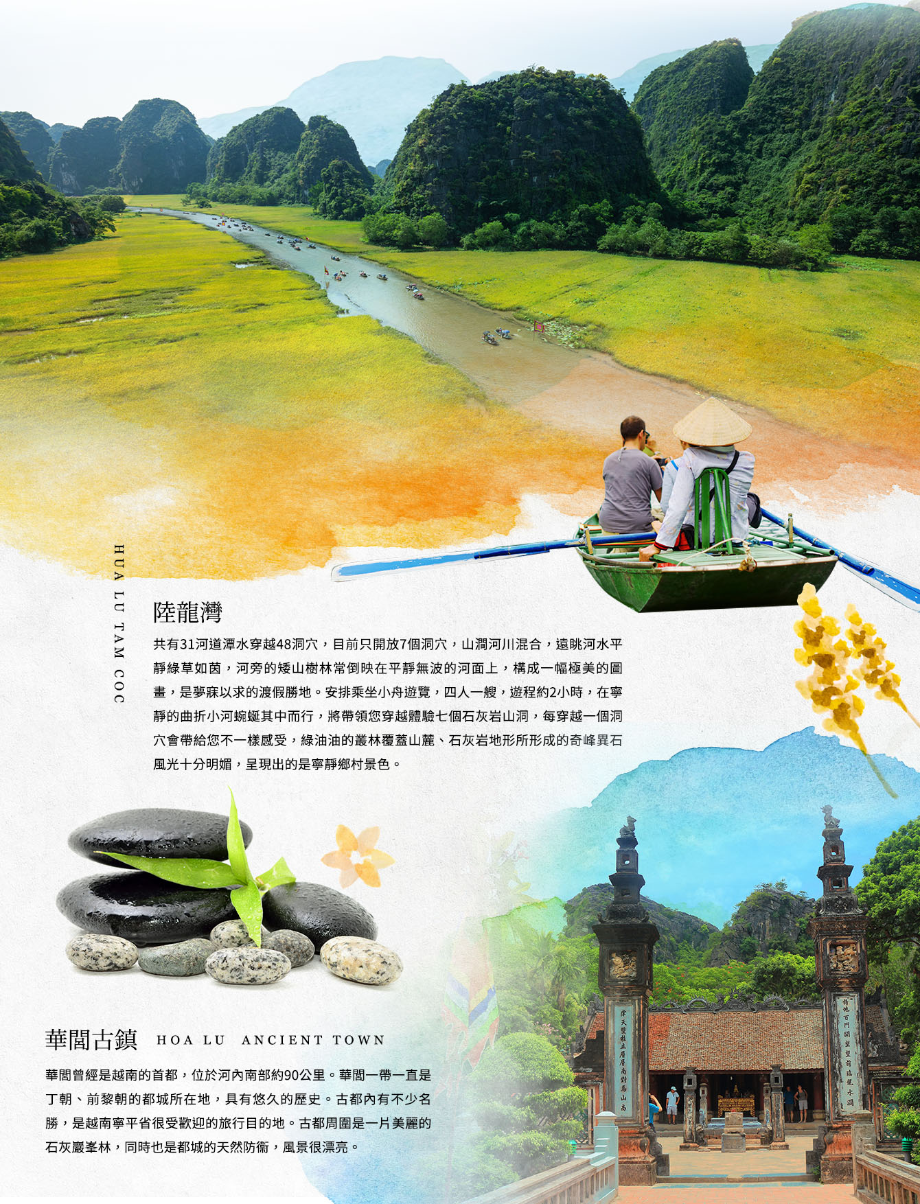 共有31河道潭水穿越48洞穴,目前只開放7個洞穴,山澗河川混合,遠眺河水平靜綠草如茵,河旁的矮山樹林常倒映在平靜無波的河面上,構成一幅極美的圖畫,是夢寐以求的渡假勝地。安排乘坐小舟遊覽,四人一艘,遊程約2小時,在寧靜的曲折小河蜿蜒其中而行,將帶領您穿越體驗七個石灰岩山洞:地靈洞、黑洞、明洞、三靈洞、山羊洞、辰谷洞、龜后洞,每穿越一個洞穴會帶給您不一樣感受,綠油油的叢林覆蓋山麓、石灰岩地形所形成的奇峰異石風光十分明媚,呈現出的是寧靜鄉村景色。沿河畔兩岸風景好比下龍灣有勝之而無不及,清澈見底,水波不興,偶見小屋,遺世獨立,小扁舟在山石間浮遊,遠眺一座座孤聳怪立的山巒,讓人覺得彷彿進入深邃 氛圍裡,緩緩的走進這塊世外桃源、清幽寧靜的幻夢奇境,讓人感覺沉浸在一股彷彿與世無爭與身體共譜出一首輕鬆悠哉的樂曲,這何嘗不是人生的奢侈享受!