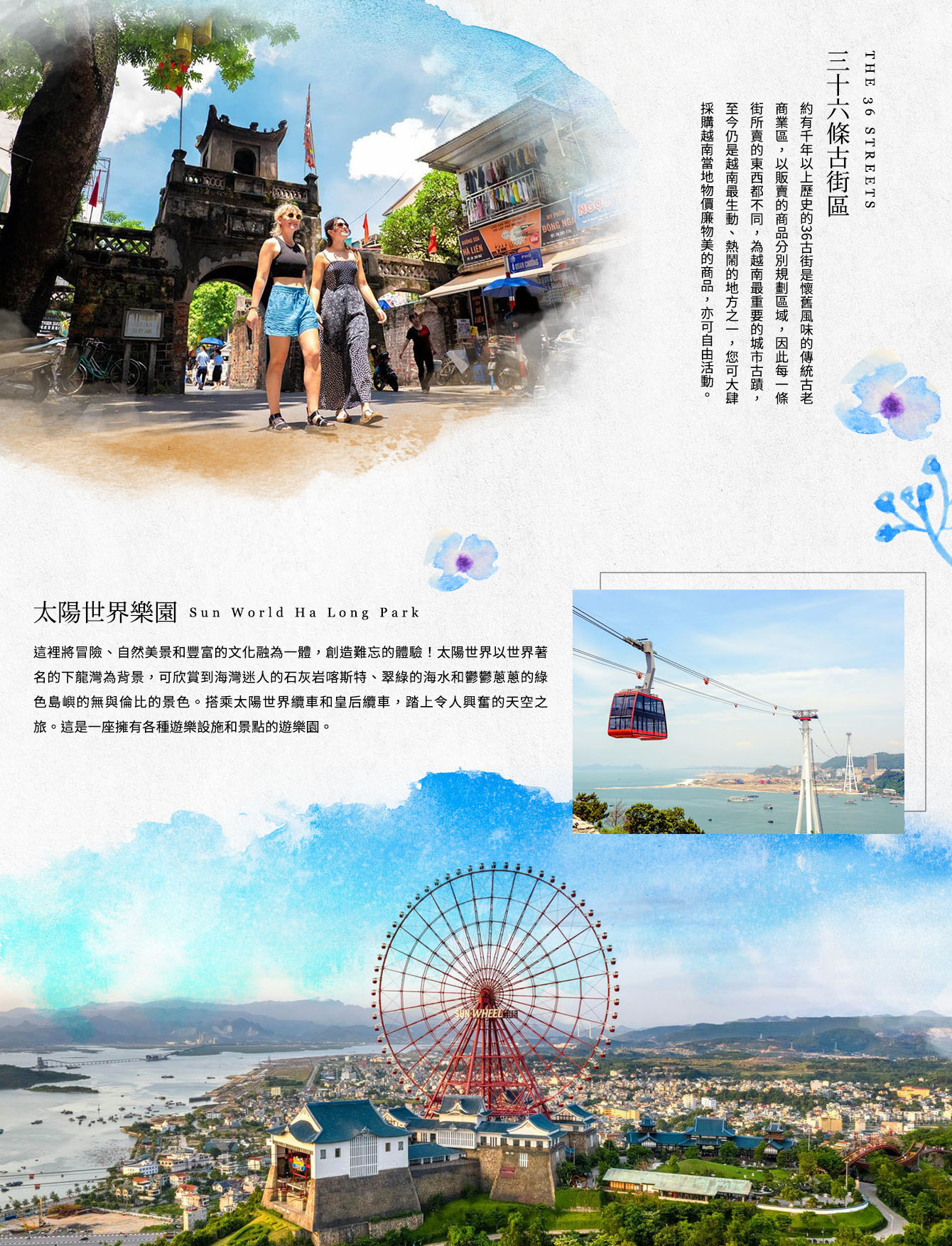 約有千年以上歷史的36古街是懷舊風味的傳統古老商業區,以販賣的商品分別規劃區域,因此每一條街所賣的東西都不同,為越南最重要的城市古蹟,至今仍是越南最生動、熱鬧的地方之一,您可大肆採購越南當地物價廉物美的商品,亦可自由活動。 註:為了您的安全,請配合導遊、領隊、指導員宣達的注意事項,並務必穿上救生衣具,謝謝合作!