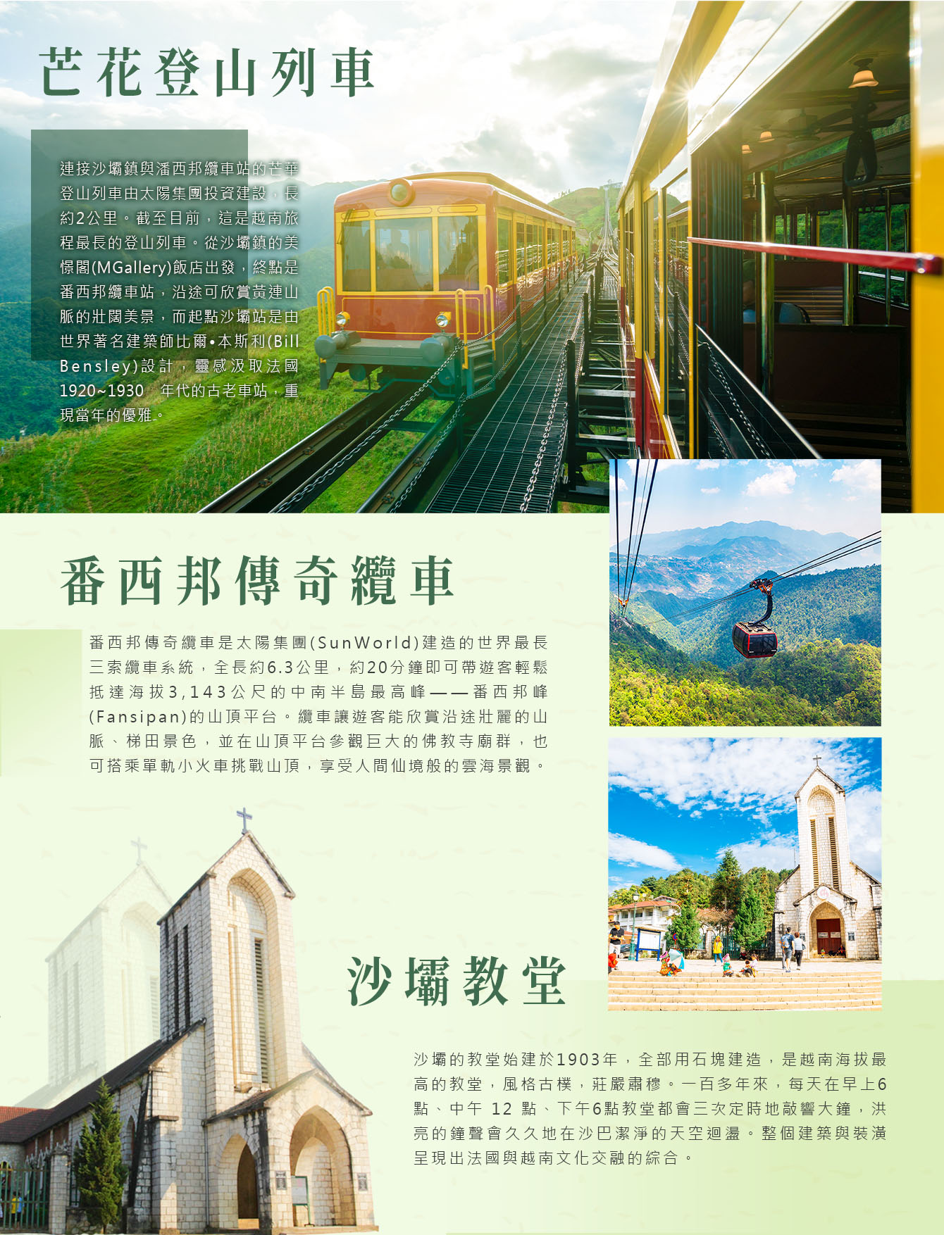 芒花登山列車】連接沙壩鎮與潘西邦纜車站的芒華登山列車由太陽集團投資建設,長約 2 公里。截至目前,這是越南旅程最長的登山列車。從沙壩鎮的美憬閣(MGallery)飯店出發,終點是番西邦纜車站,沿途可欣賞黃連山脈的壯闊美景,而起點沙壩站是由世界著名建築師比爾•本斯利(Bill Bensley)設計,靈感汲取法國1920~1930 年代的古老車站,重現當年的優雅。
