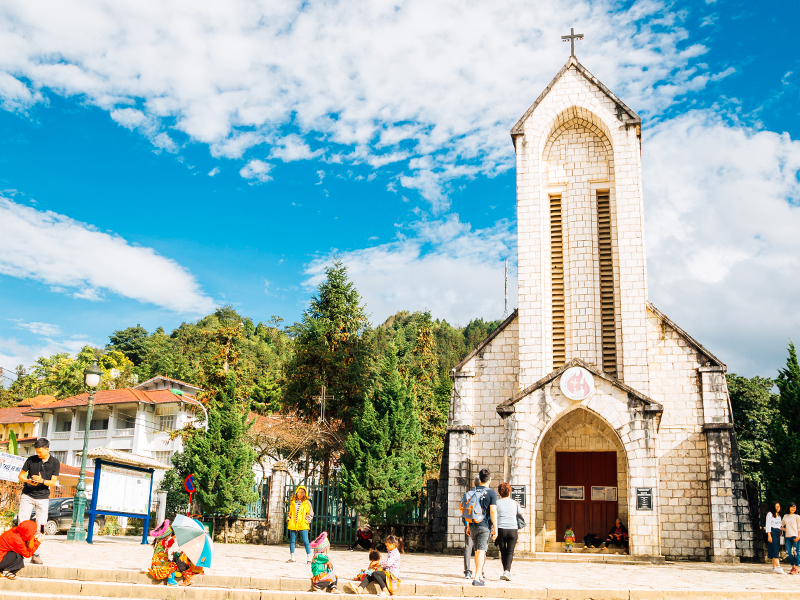 【沙壩教堂】沙壩的教堂始建於 1903 年,全部用石塊建造,是越南海拔最高的教堂,風格古樸,莊嚴肅穆。一百多年來,每天在早上 6 點、中午 12 點、下午 6 點教堂都會三次定時地敲響大鐘,洪亮的鐘聲會久久地在沙巴潔淨的天空迴盪。整個建築與裝潢呈現出法國與越南文化交融的綜合。