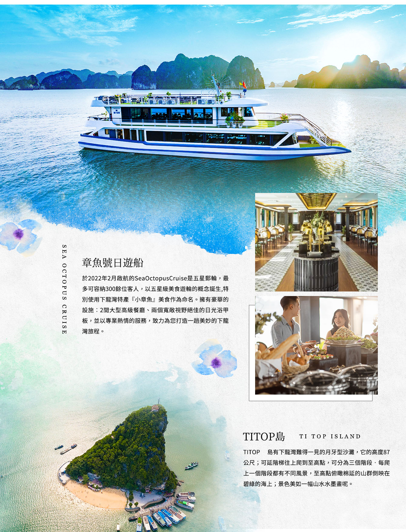 【章魚號日遊船 SEA OCTOPUS CRUISE】 於2022年2月啟航的SeaOctopusCruise是五星郵輪,最多可容納300餘位客人,以五星級美食遊輪的概念誕生,特別使用下龍灣特產『小章魚』美食作為命名。擁有豪華的設施:2間大型高級餐廳、兩個寬敞視野絕佳的日光浴甲板,並以專業熱情的服務,致力為您打造一趟美妙的下龍灣旅程。