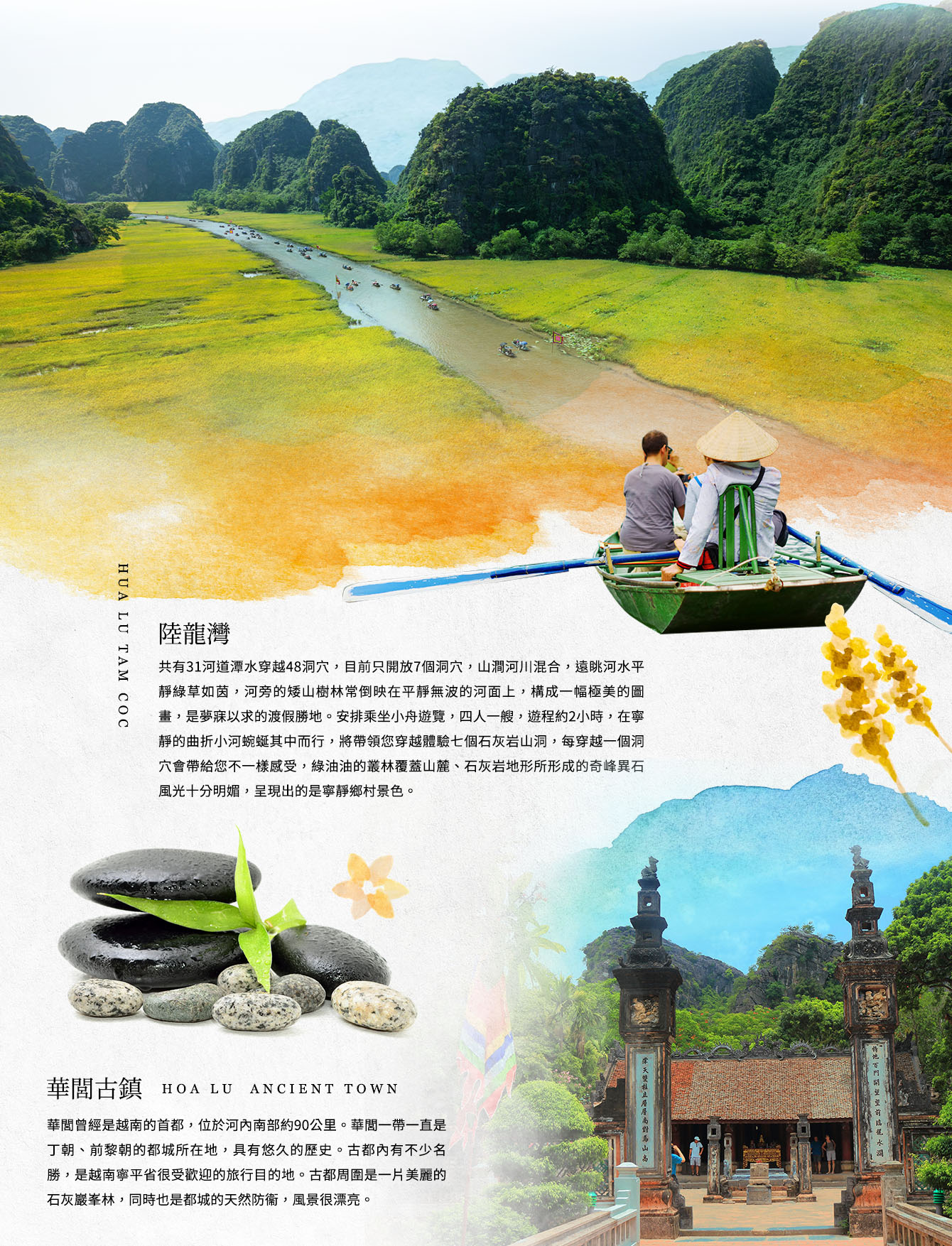 【華閭古鎮】華閭曾經是越南的首都,位於河內南部約90公里。華閭一帶一直是丁朝、前黎朝的都城所在地,具有悠久的歷史。古都內有不少名勝,是越南寧平省很受歡迎的旅行目的地。古都周圍是一片美麗的石灰巖峯林,同時也是都城的天然防衞,風景很漂亮。