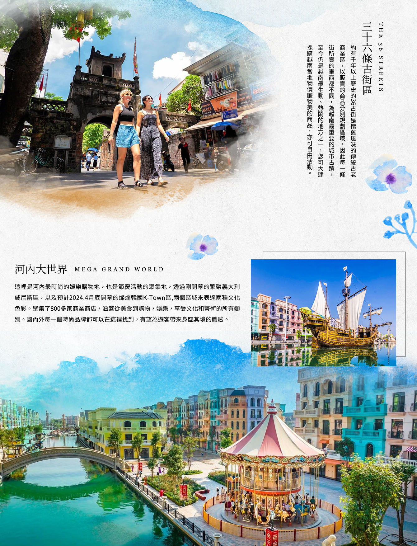 【河內大世界MEGA GRAND WORLD】這裡是河內最時尚的娛樂購物地,也是節慶活動的聚集地,透過剛開幕的繁榮義大利威尼斯區,以及預計2024.4月底開幕的燦爛韓國K-Town區,兩個區域來表達兩種文化色彩。聚集了800多家商業商店,涵蓋從美食到購物,娛樂,享受文化和藝術的所有類別。國內外每一個時尚品牌都可以在這裡找到,有望為遊客帶來身臨其境的體驗。