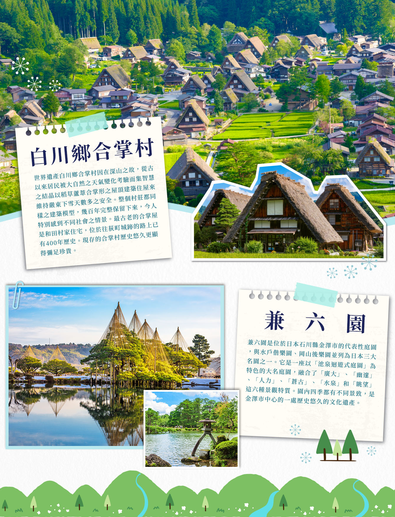 特別報告:立山黑部地區為2500米高度的山地,氣溫與平地有很大的差別,請事先準備適當保暖衣物、帽子。另外,白雪容易反光請注意防曬或攜帶太陽眼鏡等。建議帶防滑好走的鞋(或加防滑墊)方便行走,以策安全。若遇旺季人潮過多、依照官方交通工具運能限制,則部分交通工具,將微調整為「臨時直通巴士」。並依行程流暢度微調整午餐改為「山下用餐 立山日式風味御膳」或「 山上用餐 立山日式風味御膳餐盒 」。