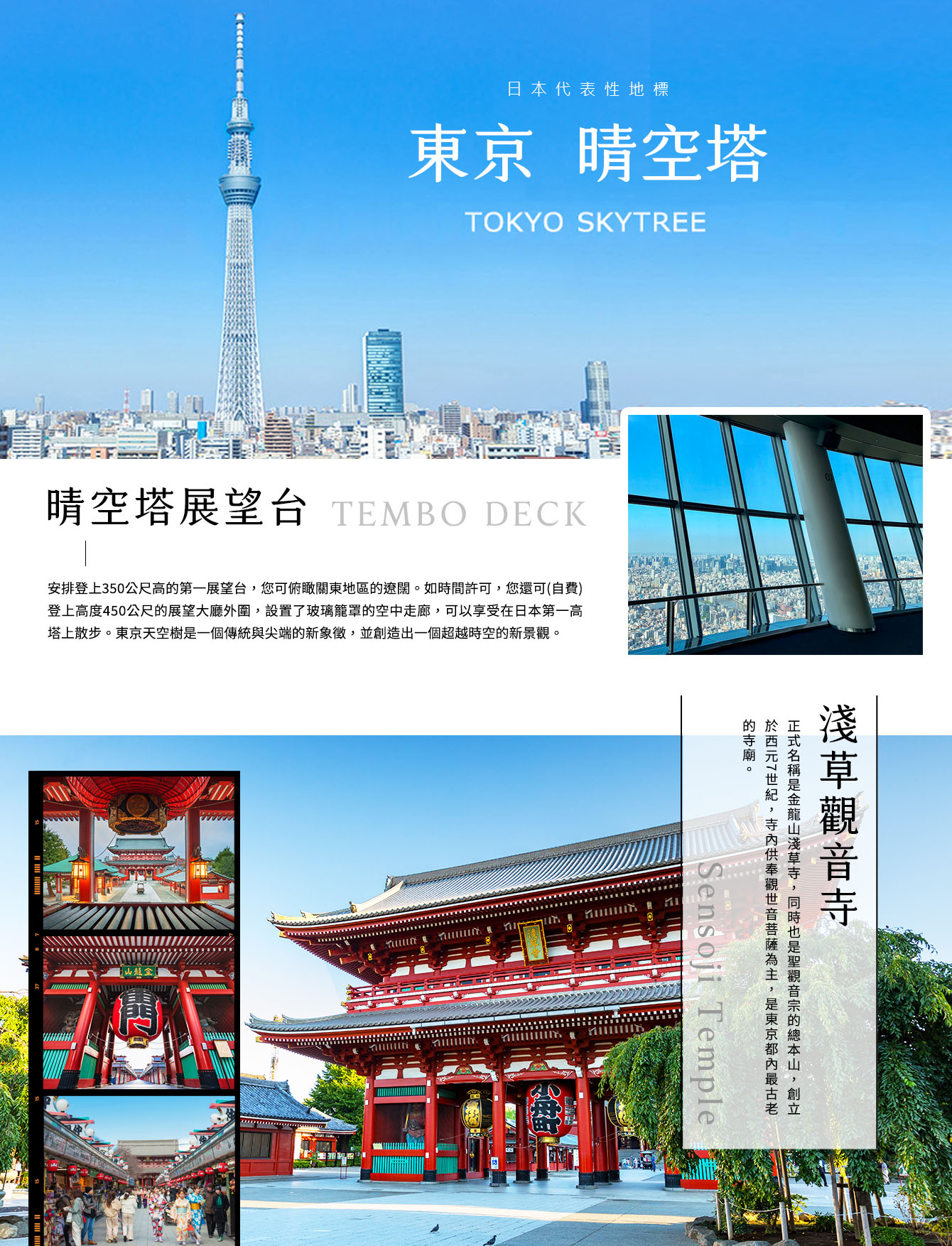 【東京晴空塔】東京晴空塔(TOKYO SKYTREE)位於東京都墨田區,是2012年完工的電波塔兼觀光地標。以634公尺高度獲金氏世界紀錄認證為「世界第一高塔」,設有350公尺的「天望甲板」與450公尺的「天望回廊」,可360度俯瞰關東平原。塔下結合「東京晴空街道」商場、水族館與星象儀,是集旅遊、美食、科學研究於一體的複合式景點。