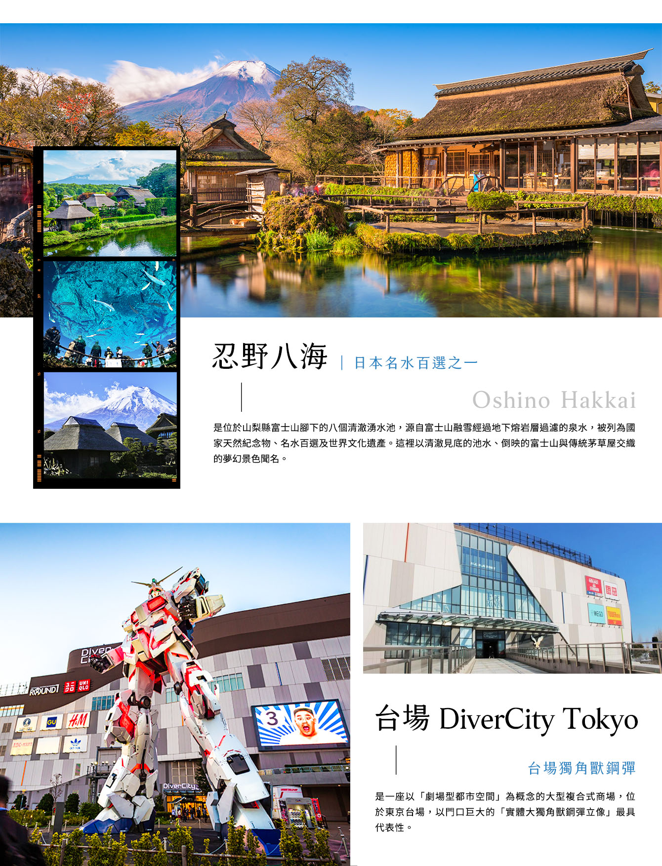 【忍野八海】有《日本九寨溝》之稱,富士山融化的雪水經過近百年的過濾,成為了如今這八處湧出的泉水,忍野八海~日本名水百選,八海意為八個池塘,入選"日本名水百選",忍野村以其優美的自然環境聞名。波光鱗鱗的池水與美麗的富士山合為一體,美不勝收。因旅遊團體,時間有限,無法所有池塘均遊覽,僅參觀1~2個池塘,敬請瞭解。