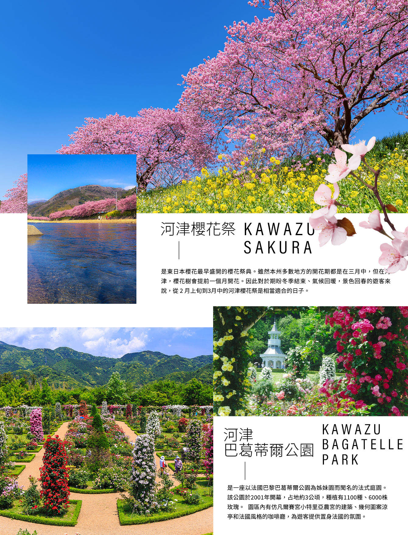 【河津巴葛蒂爾公園】是一座以法國巴黎巴葛蒂爾公園為姊妹園而聞名的法式庭園。 該公園於2001年開幕,占地約3公頃,種植有1100種、6000株玫瑰。 園區內有仿凡爾賽宮小特里亞農宮的建築、幾何圖案涼亭和法國風格的咖啡廳,為遊客提供置身法國的氛圍。