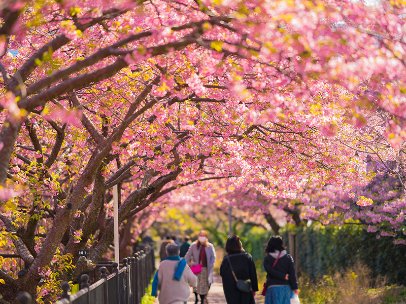 【河津櫻花祭】是東日本櫻花最早盛開的櫻花祭典。雖然本州多數地方的開花期都是在三月中,但在河津,櫻花樹會提前一個月開花。因此對於期盼冬季結束、氣候回暖,景色回春的遊客來說,從 2 月上旬到3月中的河津櫻花祭是相當適合的日子。