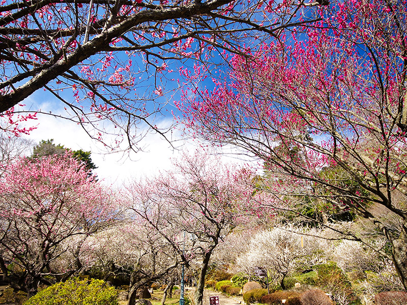 【熱海梅園】該梅園以早花林木聞名,其中有些樹木已屹立百年以上。此外,園內還有健行步道、瀑布和溫泉足浴,另有販賣梅酒與果醬的商店。