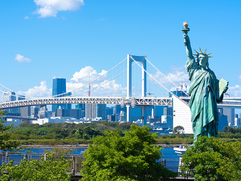 【台場】位於東京灣的人工島嶼,以其娛樂、購物和未來感十足的現代建築而聞名。 島上擁有標誌性的彩虹大橋、可以欣賞都市夜景的台場海濱公園,還有眾多購物中心、主題樂園、博物館等設施。
