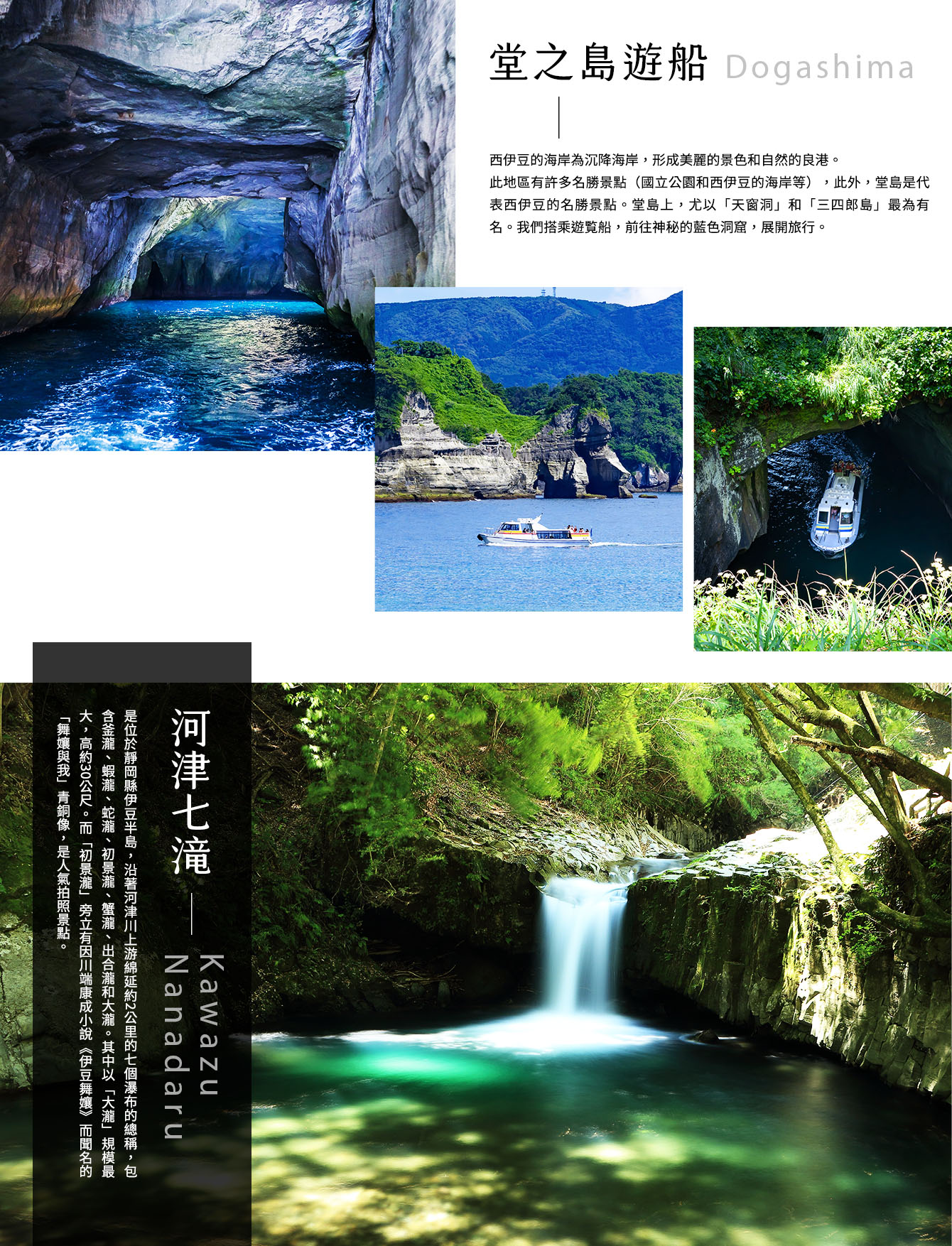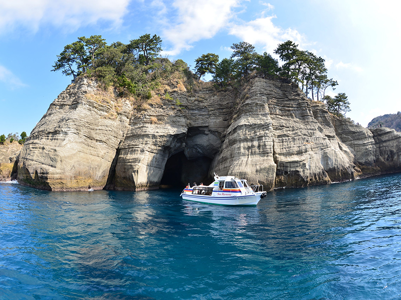 【堂之島遊船】西伊豆的海岸為沉降海岸,形成美麗的景色和自然的良港。此地區有許多名勝景點(國立公園和西伊豆的海岸等),此外,堂島是代表西伊豆的名勝景點。堂島上,尤以「天窗洞」和「三四郎島」最為有名。我們搭乘遊覧船,前往神秘的藍色洞窟,展開旅行。天窗洞於1935年,被指定為天然記念物。洞窟是有3個入口的海蝕洞,南口特別大,長147m。洞窟頂部有又大又圓的洞,美麗的陽光從中灑落。TENSO意指天窗。此洞窟充滿了刺激與夢幻。