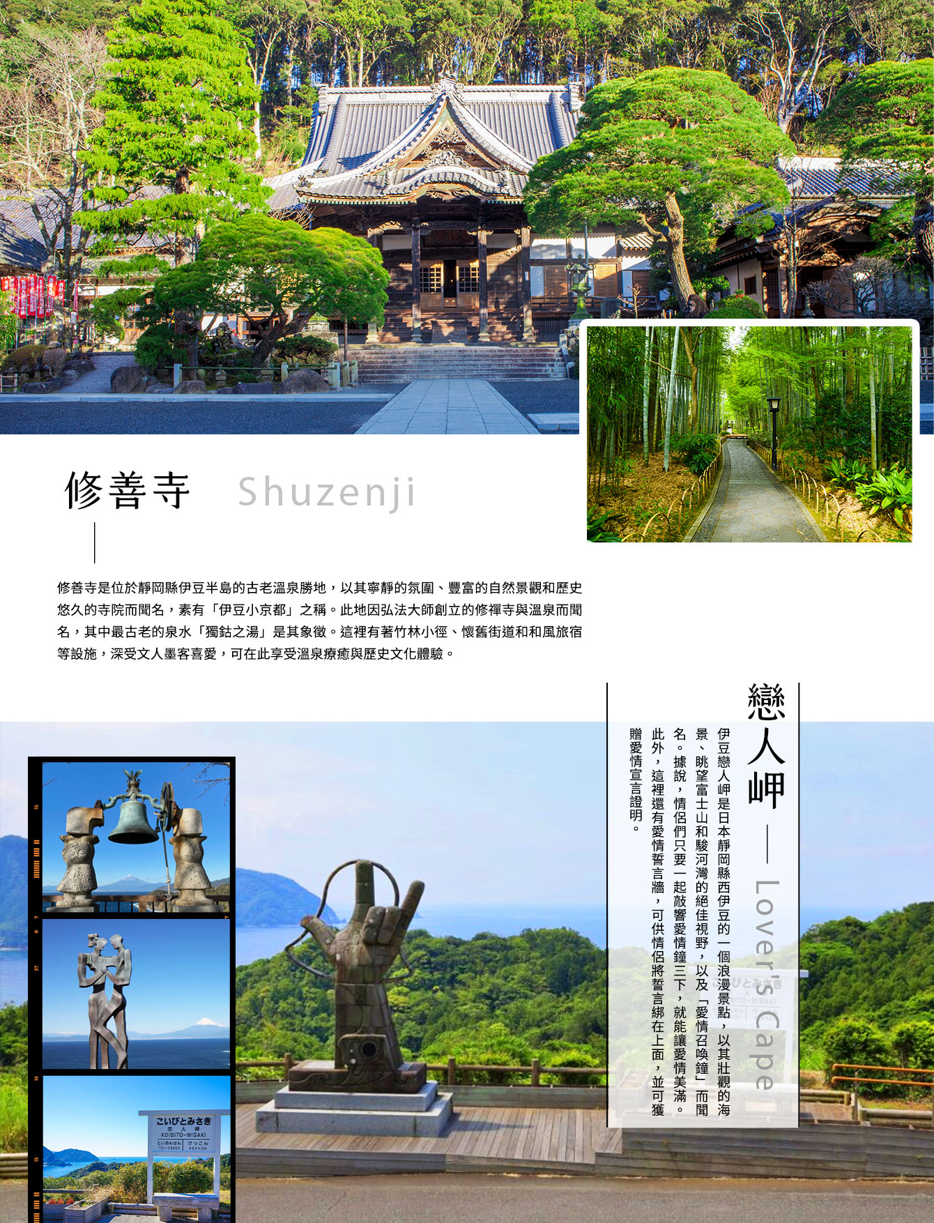 【戀人岬】從位於西伊豆的戀人岬眺望,可以將駿河灣對面的富士山美景盡收眼底。而一直延續到山岬為止的遊歩道風景如畫,最適合散步。據說最初住在山岬周邊的情侶一起鳴鐘確認彼此的愛意,吸引了眾多遊客紛至沓來,浪漫的戀人岬由此得名,還根據傳說再現了愛情鍾,一直延續至今。