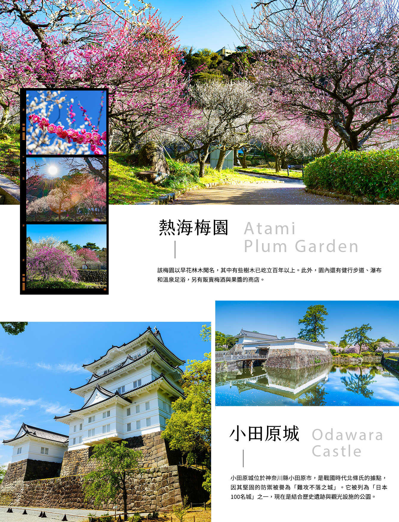 【小田原城】戰國時代曾是知名的難攻不落之城,是許多歷史迷們朝聖的必訪一站,別稱「小峰城」或「小早川城」。1495年,伊勢宗瑞(一般稱爲北條早雲)把小田原城收入掌中,奠定了北條五代的基礎︒1590年,爲了防禦豐臣秀吉來襲,增建了全長9公里的巨大防敵土牆及護城壕(日語稱爲“總構”)︒但是仍然無法對抗强大無比的豐臣大軍,城主終於投降和平開城︒其後,大久保忠鄰一旦成爲城主,旋而又被奪取城主身份︒城主位空之間,江戸幕府另派“城番”守城,而後稻葉正勝入主小田原成爲城主︒1633年因爲受到地震災害,城堡大加修建,遂成現今的城堡面貌︒北條時代的城堡尚留存有“總構”護城壕及防敵土牆的一部分,現在被指定爲國家史跡,接受政府保護︒