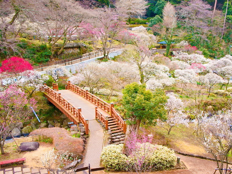 【熱海梅園】該梅園以早花林木聞名,其中有些樹木已屹立百年以上。此外,園內還有健行步道、瀑布和溫泉足浴,另有販賣梅酒與果醬的商店。