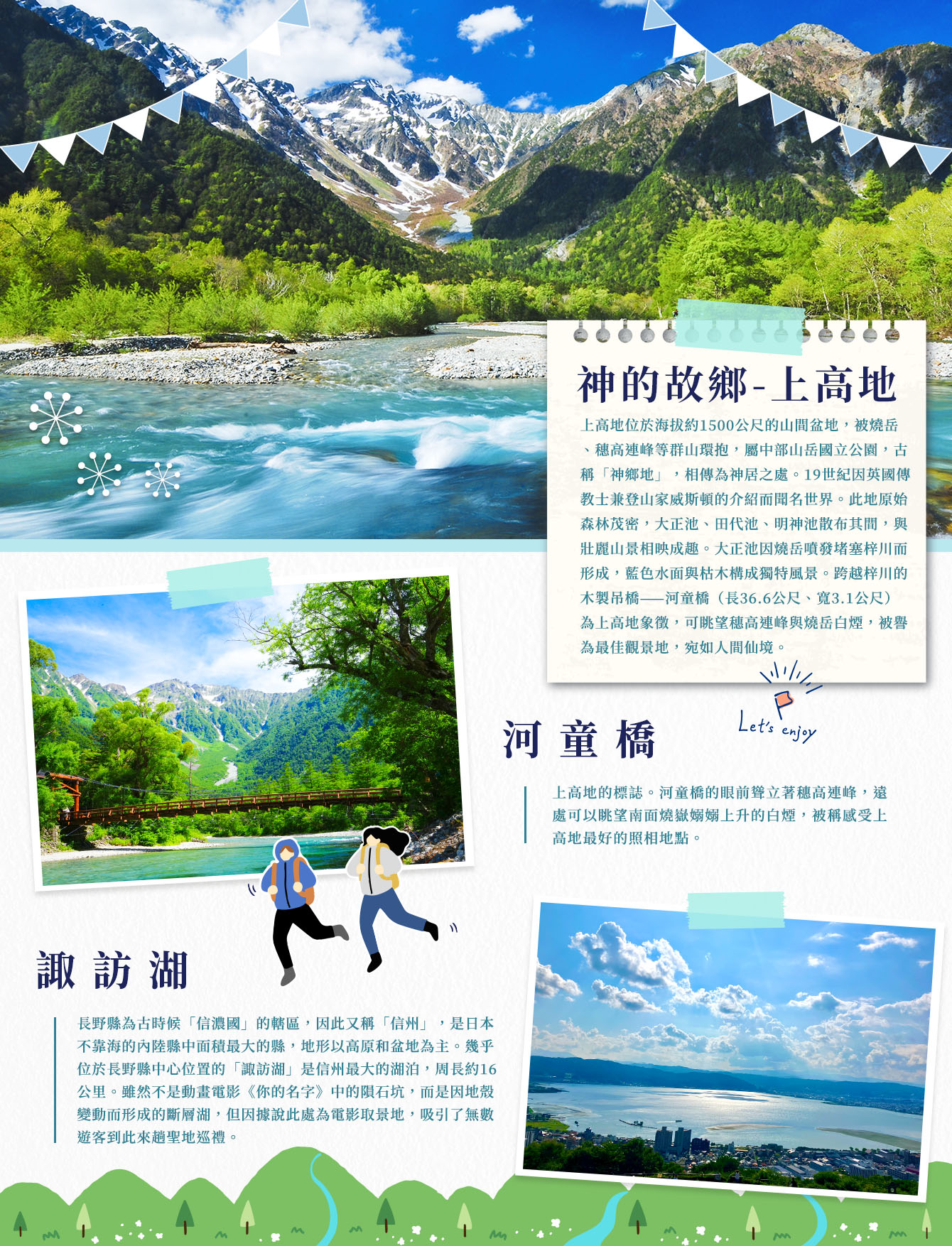 【上高地】被日本人視作神的故鄉,上高地是標高約1500公尺的小盆地,四周被燒岳、常念山脈、穗高連峰等高山環抱,屬於中部山嶽國立公園。古時被稱為 "神鄉地",相傳是神居住的地方。經19世紀之英國傳教士兼登山家沃思特•威斯頓的介紹而廣被全世界的登山家所知,成為日本著名的風景勝地。這一帶被白樺、落葉松等的原始森林環繞,大正池、田代池、明神池等分佈在其間,與高聳的各山群的雄姿一起構成了極美的景色。大正池是20世紀初由於燒嶽的噴火、梓川受堵所形成的池。其藍色的水面上突顯的枯樹與周圍構成一種獨特的風景。而搭建在梓川上的河童橋現已成為上高地的標誌;河童橋長36.6M、寬3.1M,為木制的吊橋。站在橋上看著眼前聳立的穗高連峰,遠眺南面燒岳嫋嫋上升的白煙,被稱為上高地最好的風景勝地,真是宛如人間仙境。