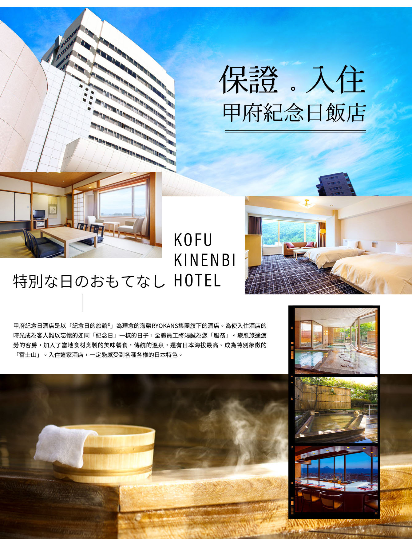 住宿:甲府記念日飯店 (或) 諏訪湖溫泉飯店 (或) 長野松代美居溫泉度假酒店 (或) 同級