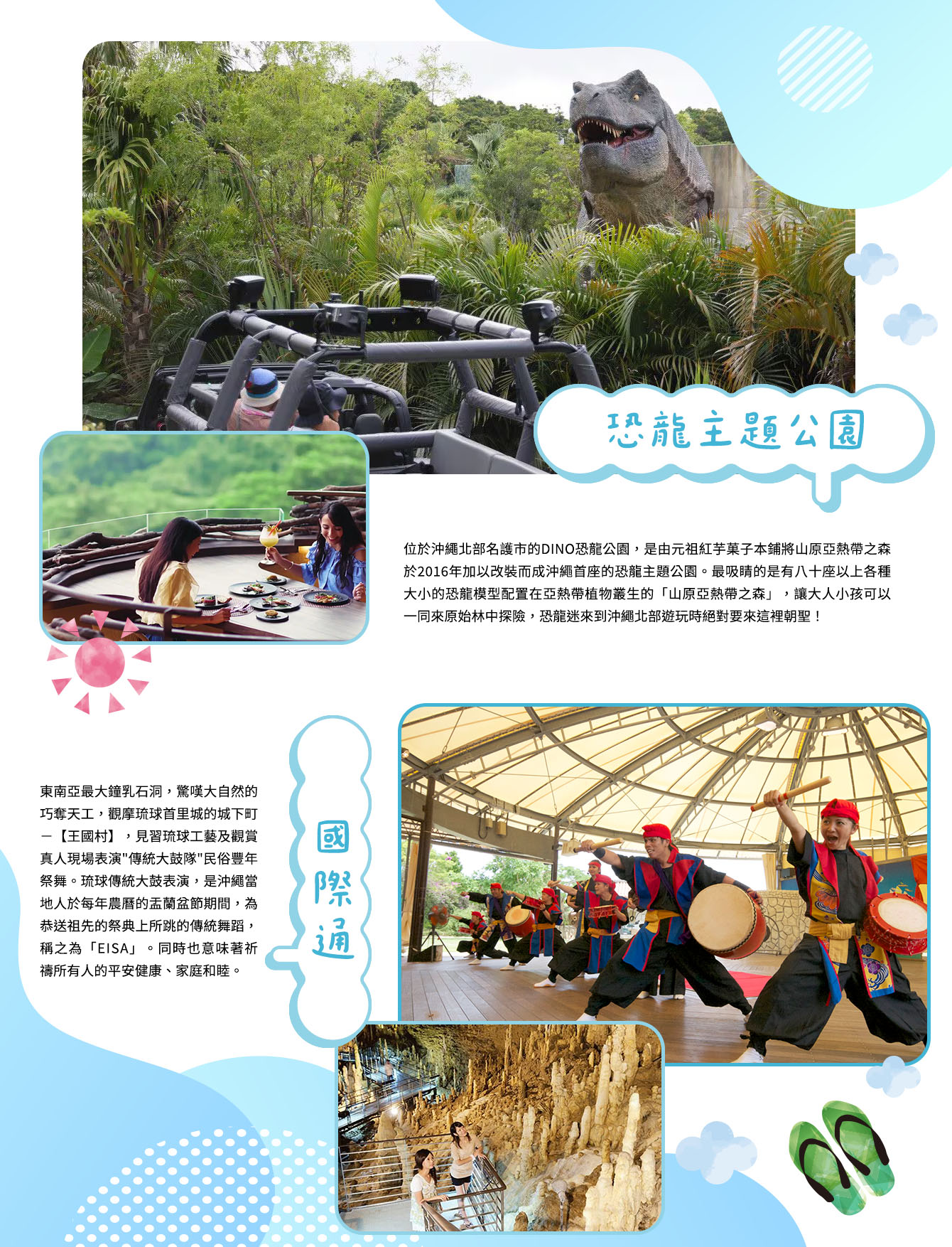 東南亞最大鐘乳石洞,觀賞95萬支的各式石筍天然鐘乳石,驚嘆大自然的巧奪天工,觀摩琉球首里城的城下町-王國村,見習琉球工藝、民藝、手藝傳統的藝能場-製陶瓷場、玻璃工場、製酒場、製黑糖工場、王朝時代的織布染布工場、古代的木屋、朝貢船、熱帶果樹園及觀賞真人現場表演"傳統大鼓隊"民俗豐年祭舞。琉球傳統大鼓表演,是沖繩當地人於每年農曆的盂蘭盆節期間,為恭送祖先的祭典上所跳的傳統舞蹈,稱之為「EISA」。同時也意味著祈禱所有人的平安健康、家庭和睦。