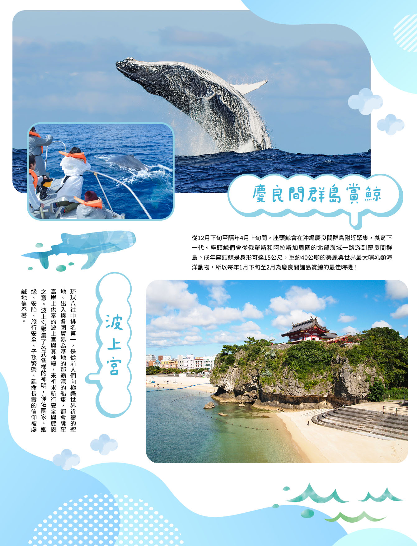 【慶良間群島賞鯨】從12月下旬至隔年4月上旬間,座頭鯨會在沖繩慶良間群島附近聚集,養育下一代。座頭鯨們會從俄羅斯和阿拉斯加周圍的北部海域一路游到慶良間群島。成年座頭鯨是身形可達15公尺,重約40公噸的美麗與世界最大哺乳類海洋動物,所以每年1月下旬至2月為慶良間諸島賞鯨的最佳時機!