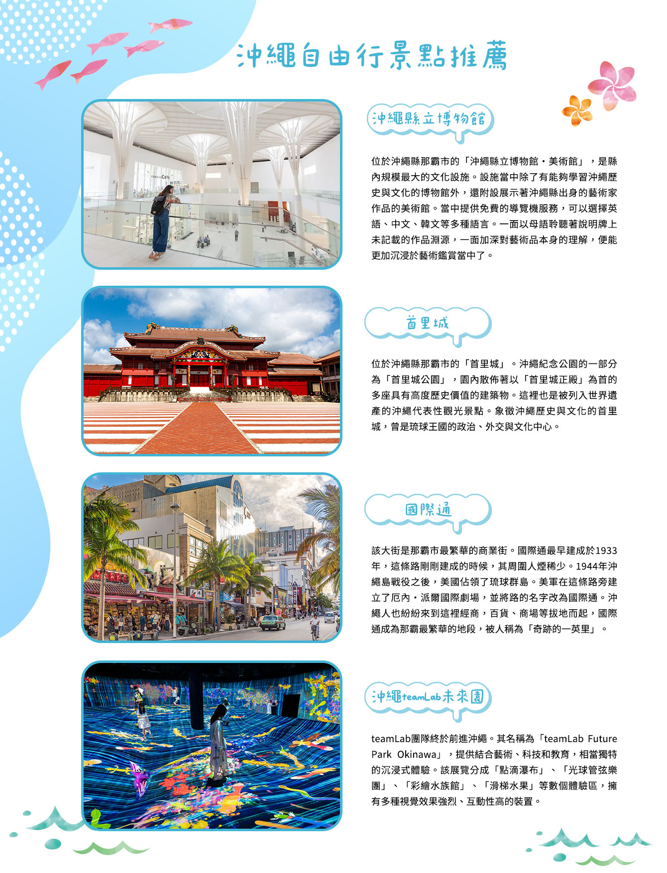 早餐後可自行前往那霸市區逛街選購伴手禮,後搭乘專車前往機場,結束此次愜意的沖繩之旅。