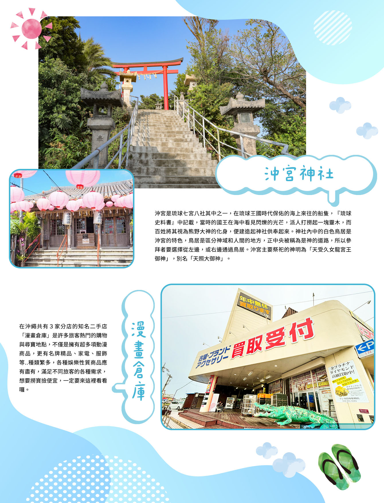 【沖宮神社】沖宮是琉球七宮八社其中之一,在琉球王國時代保佑的海上來往的船隻,『琉球史料書』中記載,當時的國王在海中看見閃爍的光芒,派人打撈起一塊靈木,而百姓將其視為熊野大神的化身,便建造起神社供奉起來。神社內中的白色鳥居是沖宮的特色,鳥居是區分神域和人間的地方,正中央被稱為是神的道路,所以參拜者要選擇從左邊,或右邊通過鳥居。沖宮主要祭祀的神明為「天受久女龍宮王御神」,別名「天照大御神」。