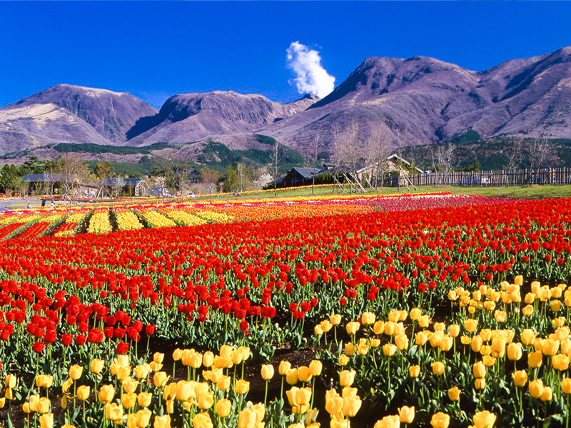 【久住花公園】大分縣竹田市九重花卉公園位於阿蘇國立公園內的九重台地。這裡是一座一年四季皆可以欣賞美麗自然風光的花卉公園,以日本百座名山之一的九重山脈和遠處的阿蘇五峰為背景,可以欣賞到500種,500萬株各色鮮花!