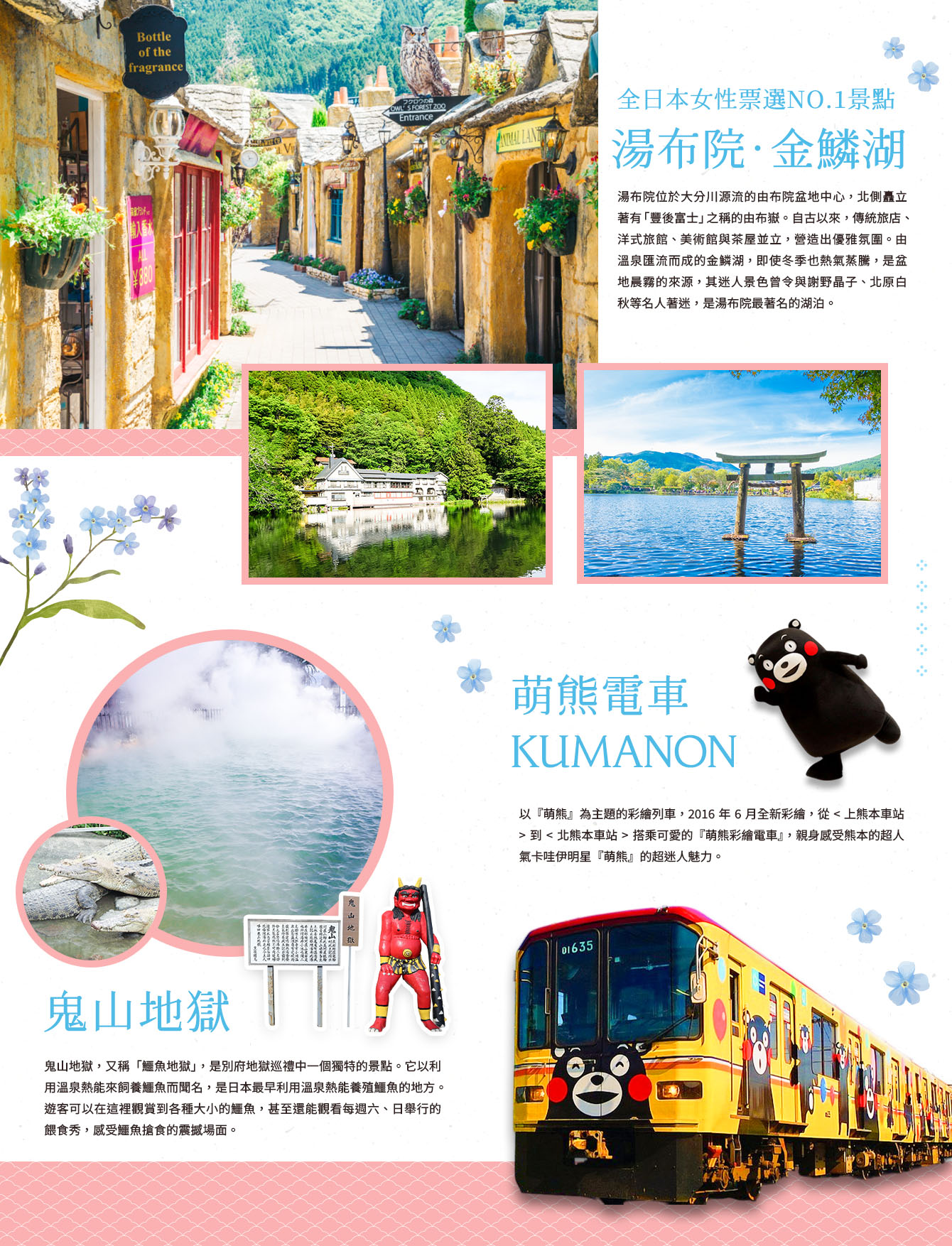 【萌熊電車Kumamon】以『萌熊』為主題的彩繪列車,2016年6月全新彩繪,行程特別安排從<上熊本車站>到<北熊本車站>搭乘可愛的『萌熊彩繪電車』,親身感受熊本的超人氣卡哇伊明星『萌熊』的超迷人魅力。在北熊本車站內備有熊本電鐵限定商品及萌熊商品,可在此歡樂選購。