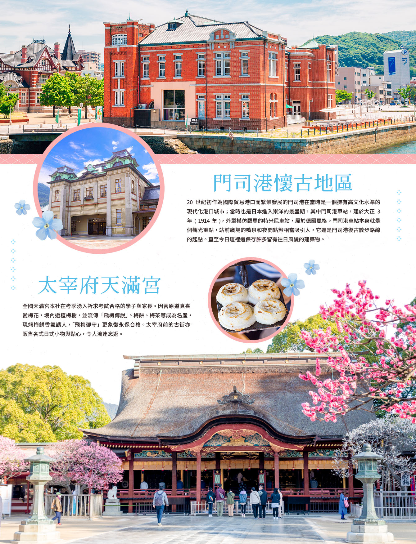 【太宰府天滿宮】是全國天滿宮本社,每逢考試期間,就擠滿了祈求考試合格的學子及家長;由於菅原道真愛梅,天滿宮園中遍植梅樹而有「飛梅傳說」之稱,梅餅、梅茶等更是當地著名特產。附近販賣的現烤的「梅餅」更是美味。還有永保終身的「飛梅御守」更是一絕。太宰府前的日式古街裡,販賣著各式各樣的日本小飾品與名產點心,絕對讓您心動不已。