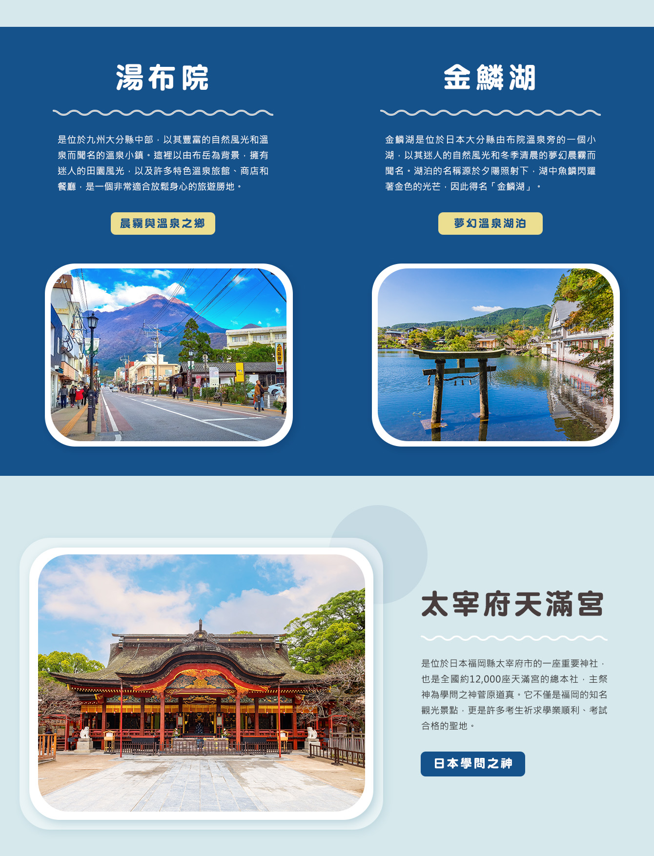 【太宰府天滿宮】是全國天滿宮本社,每逢考試期間,就擠滿了祈求考試合格的學子及家長;由於菅原道真愛梅,天滿宮園中遍植梅樹而有「飛梅傳說」之稱,梅餅、梅茶等更是當地著名特產。附近販賣的現烤的「梅餅」更是美味。還有永保終身的「飛梅御守」更是一絕。太宰府前的日式古街裡,販賣著各式各樣的日本小飾品與名產點心,絕對讓您心動不已。