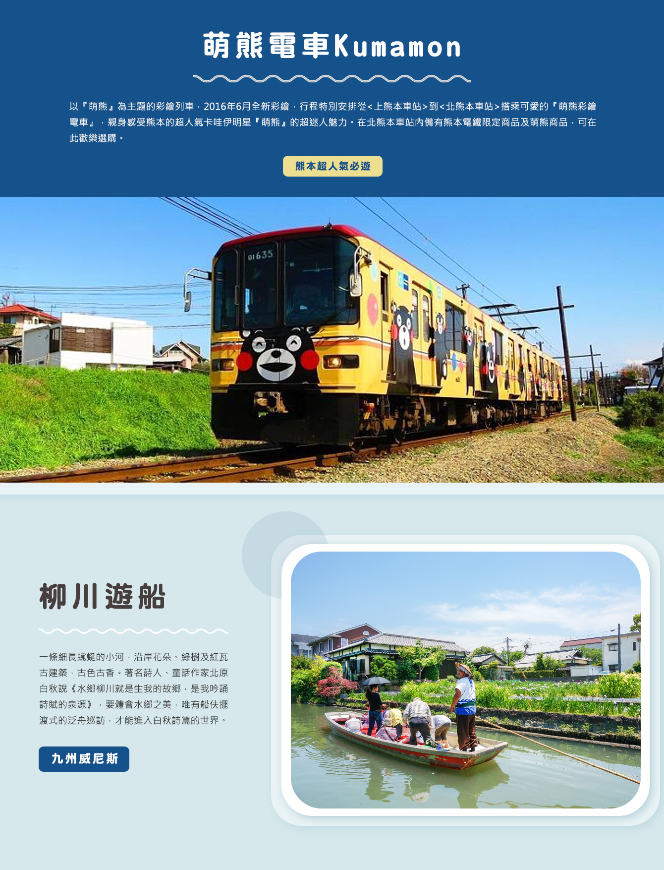 【萌熊電車Kumamon】以『萌熊』為主題的彩繪列車,2016年6月全新彩繪,行程特別安排從<上熊本車站>到<北熊本車站>搭乘可愛的『萌熊彩繪電車』,親身感受熊本的超人氣卡哇伊明星『萌熊』的超迷人魅力。在北熊本車站內備有熊本電鐵限定商品及萌熊商品,可在此歡樂選購。