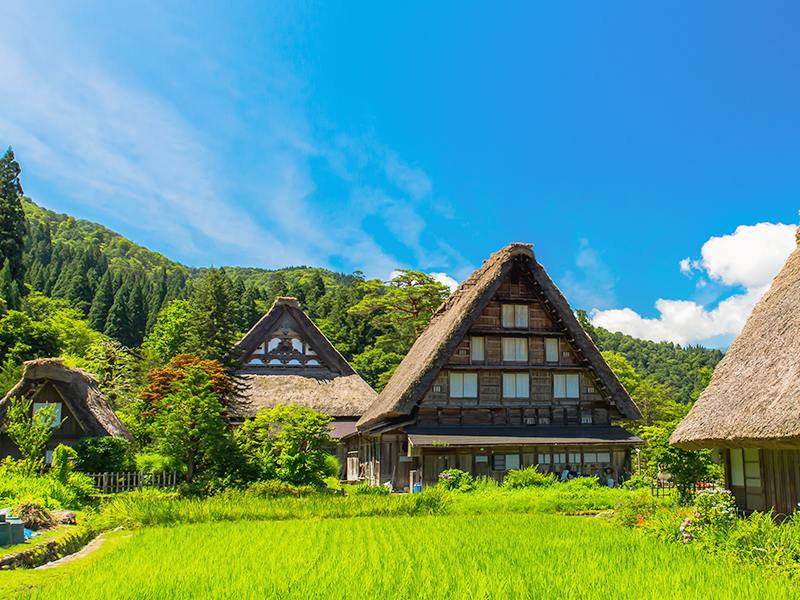 【白川鄉合掌村】世界遺跡之處,將兩個建材合併成叉手三角形狀屋頂,稱為「合掌」,可減少受風力,且調節日照量,使屋內得以冬暖夏涼。因在深山之故,從古以來居民被大自然之天氣變化考驗而集智慧之結晶以稻草蘆葦合掌形之屋頂建築住屋來維持嚴東下雪天數多之安全。因整個村莊都同樣之建築模型,幾百年均沒改變完整保留下來,今人特別感到不同社會之情景。