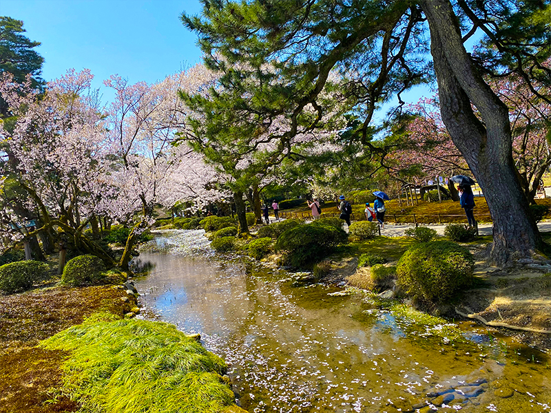 【金澤兼六園】日本三大名園之首,與岡山後樂園、水戶階樂園齊名,亦是日本式庭園的典範。名為兼六,因園中兼具有《宏大、幽邃、人力、蒼古、水泉、眺望》等六大優點而著名;園中古代風格的造景,為庭園景緻之極至。內有列入金氏紀錄的日本最古老噴泉。