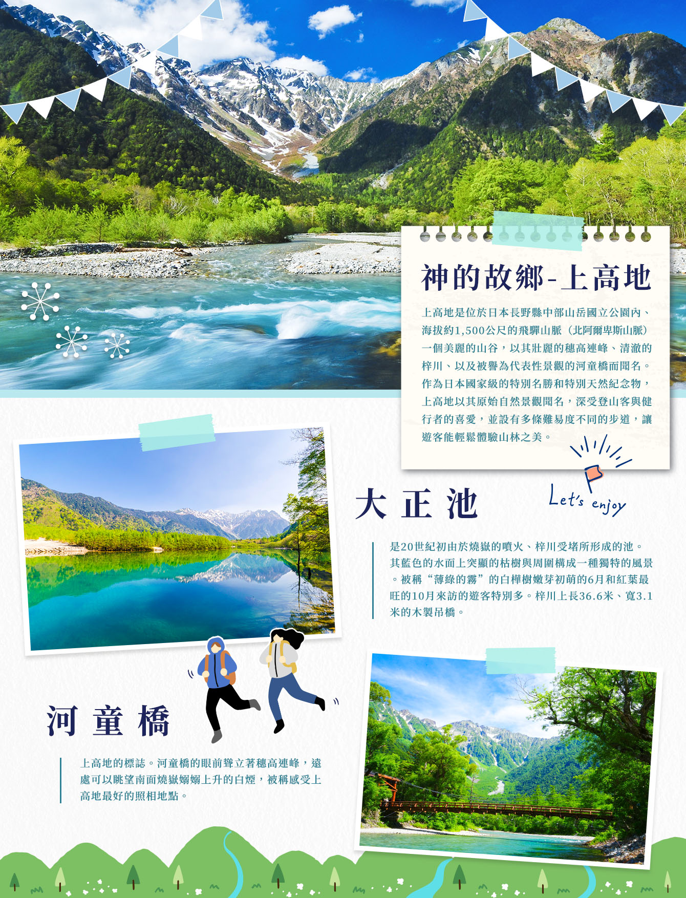 ※備註1:上高地預計開放期間:4月17日~11月15日,若遇上高地尚未開放或者因氣候及路況等因素而無法進入時,行程將改往平湯瀑布及大王山葵農場,並贈送日幣300元的哇沙米冰淇淋,敬請了解。