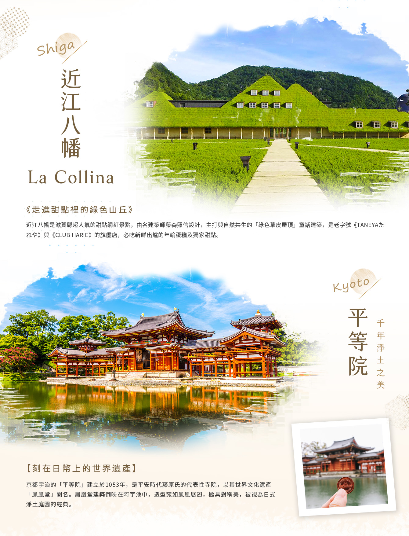 【平等院】該院興建於西元1053年,由平安時代權傾一時的藤原賴通改建其父別院,規模相當今日1/2宇治面積的平等院乃為引入宇治川水,依佛教末法之境,在水池之西建造阿彌陀堂,水池之東則建構象徵今世的拜殿,是為『淨土庭園』,其規格更為後來日式庭園的參考指標。